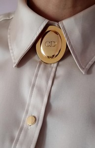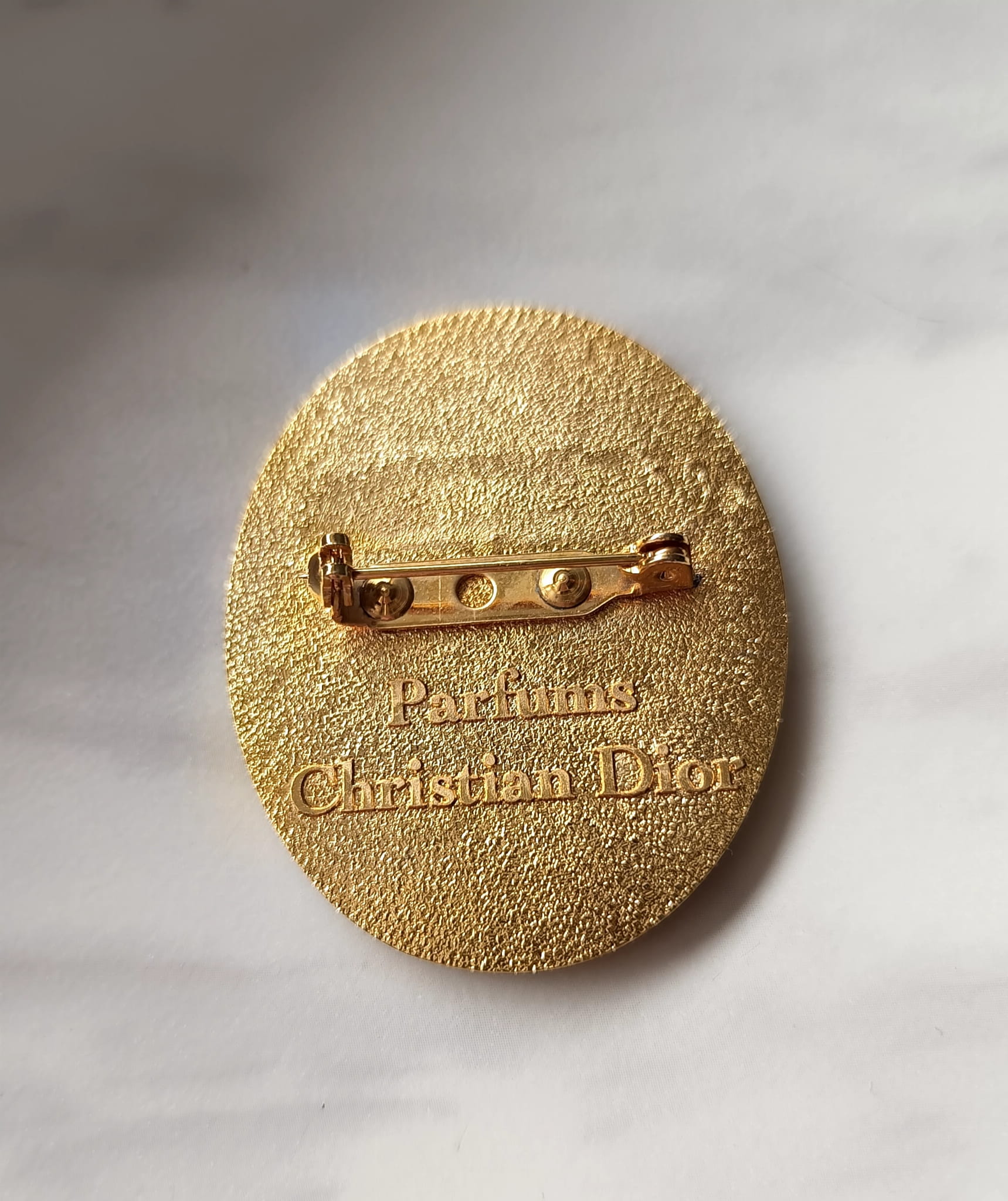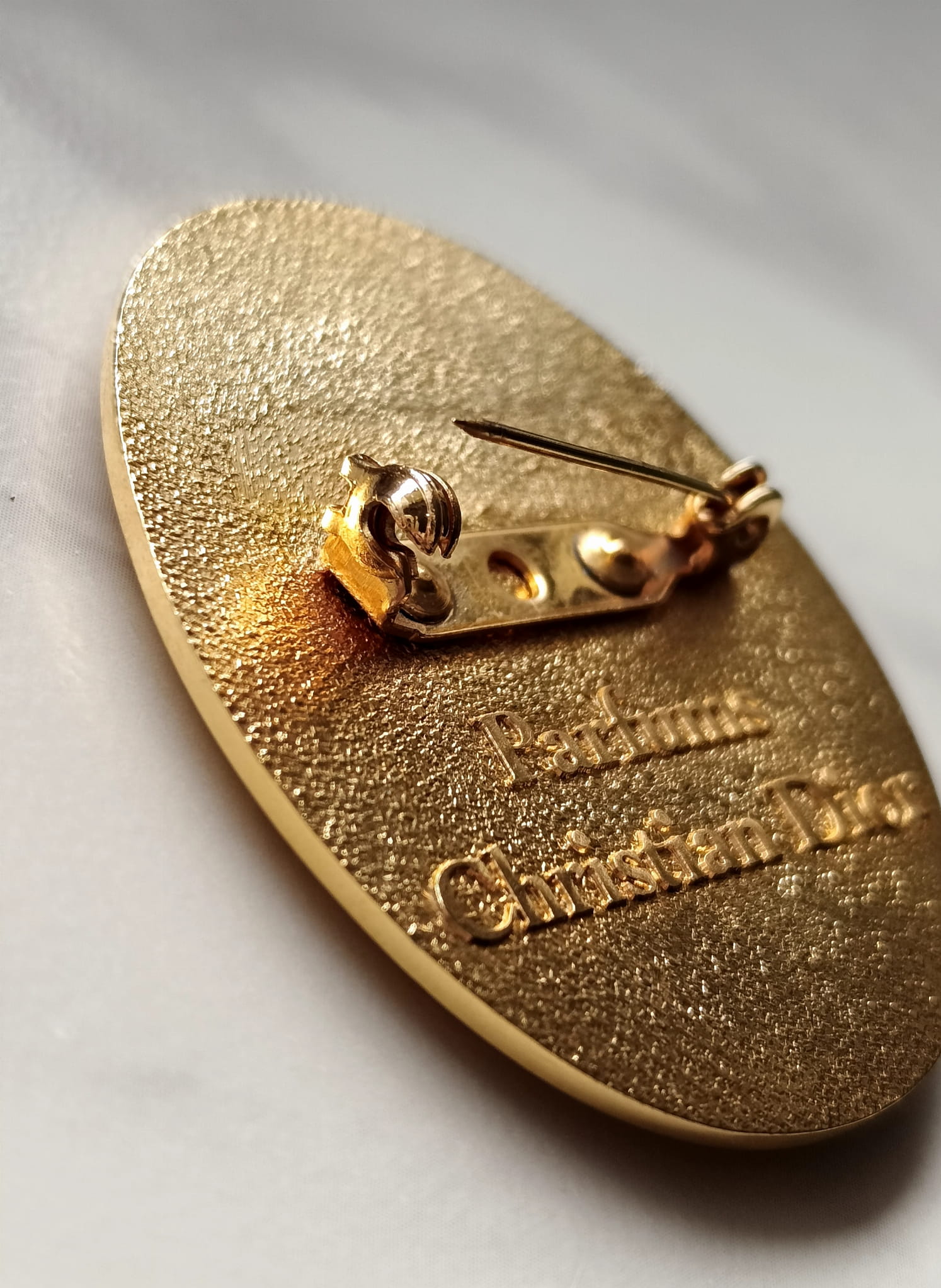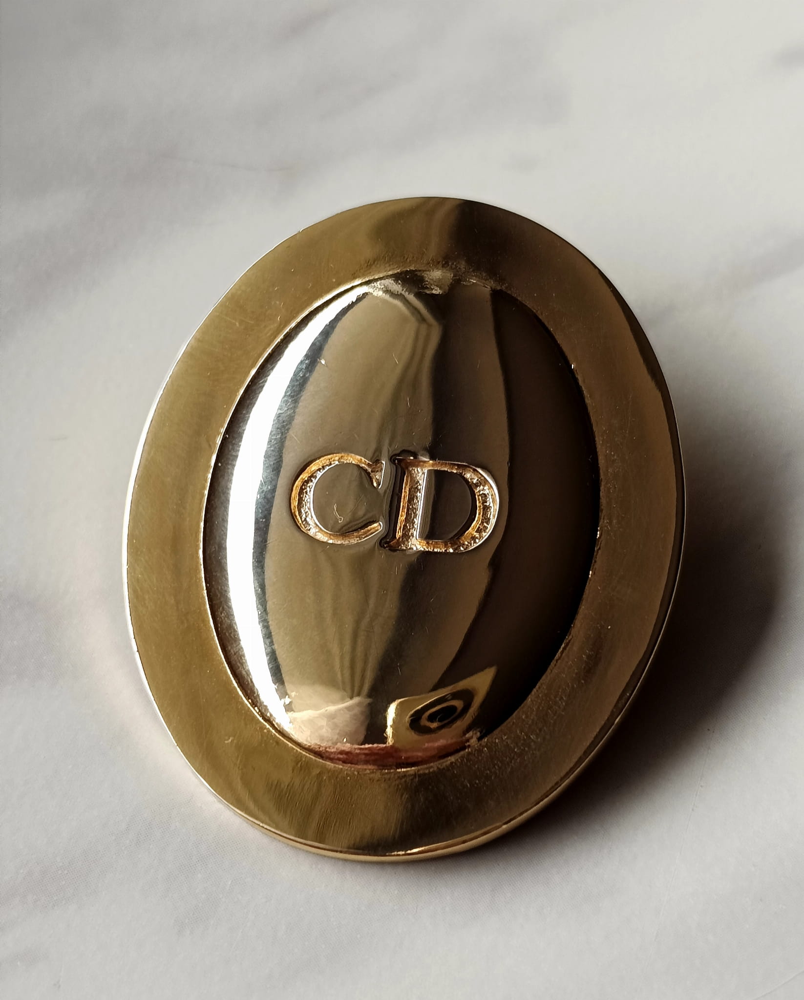 Vintage broszka od marki Dior, pozłacana, logowana z tyłu oraz z tłoczonym logo z przodu. Broszka nie posiada rys ani żadnych innych śladów użytkowania.