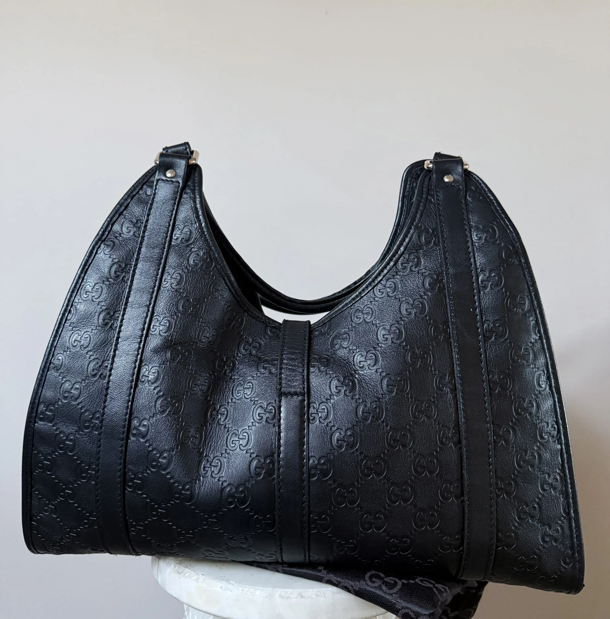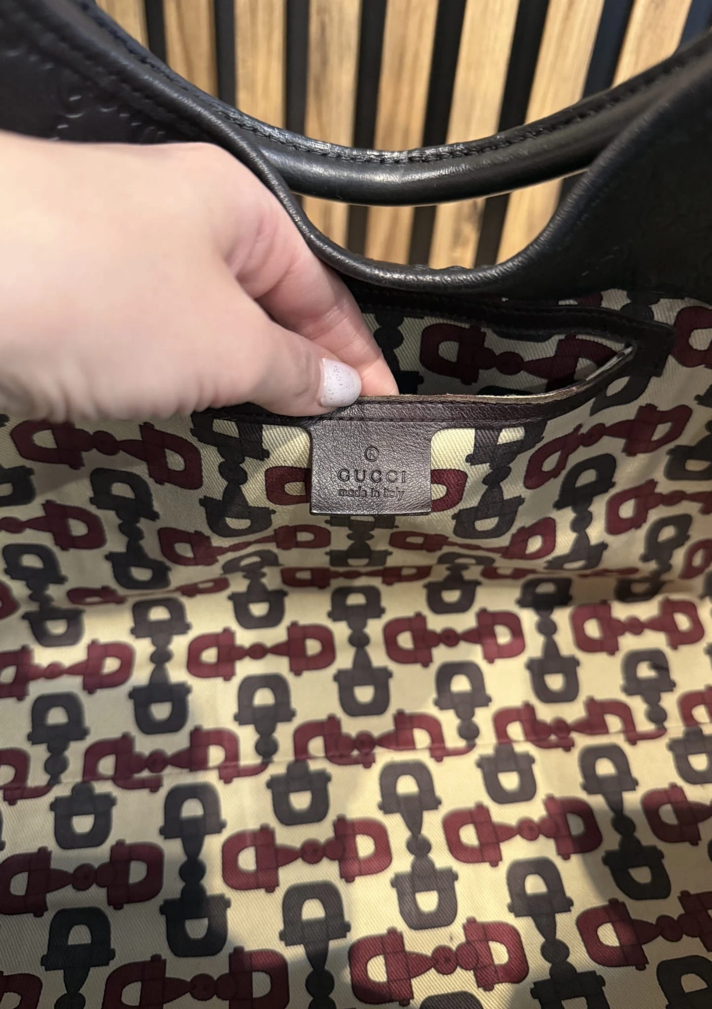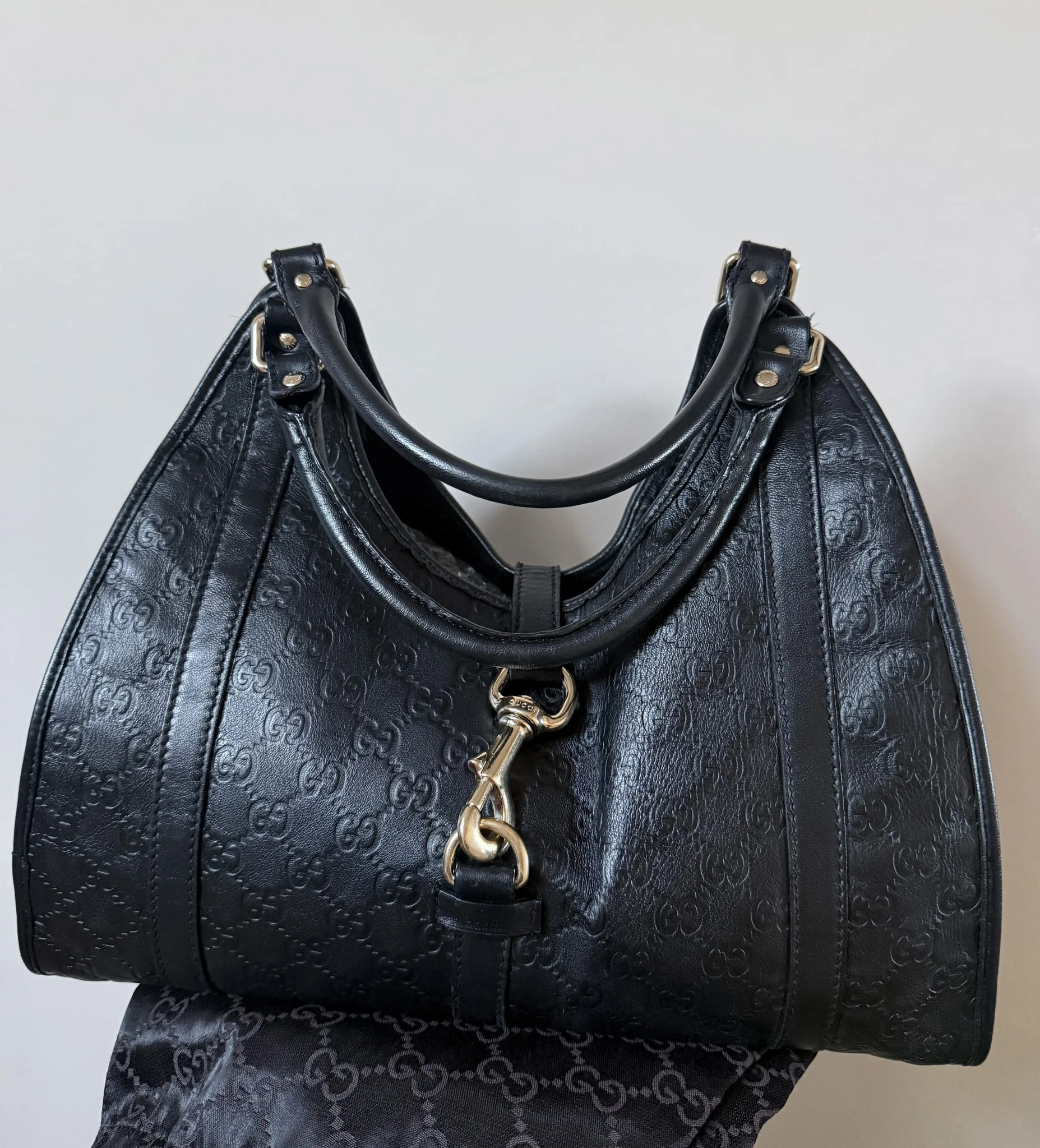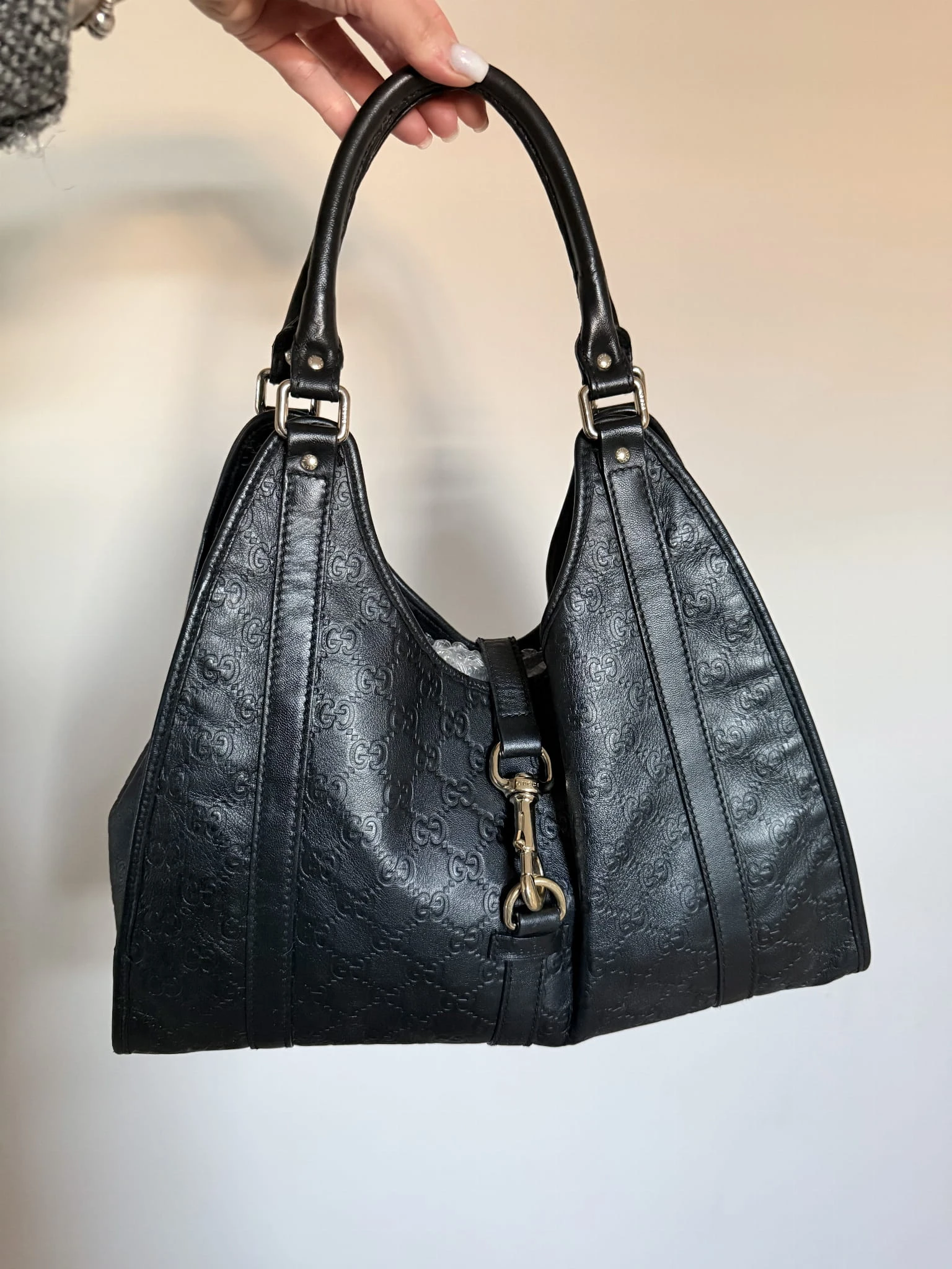 Elegancka, czarna torebka Gucci Jackie wykonana z miękkiej skóry o subtelnie tłoczonym wzorze monogramu guccissima. Jej klasyczny, półokrągły kształt nadaje jej ponadczasowego i wyrafinowano charakteru, a solidne, krótkie rączki zapewniają wygodę noszenia w dłoni lub na ramieniu. Skóra zachowana została w bardzo dobrym stanie, bez żadnych uszkodzeń czy otarć. Na przodzie robi się „zakładka”, natomiast nie jest to w żaden sposób uszkodzona skóra. Wnętrze zdobi podszewka ozdobiona wzorem inspirowanym końmi, który nawiązuje do dziedzictwa Gucci , marki założonej w 1921 roku. Torebka wyróżnia się charakterystycznym zapięciem z przodu, metalowe okucia są w złotym kolorze. Torebka jest w wygodnym rozmarz medium wraz z pokrowcem i certyfikatem autentyczności Entrupy.
