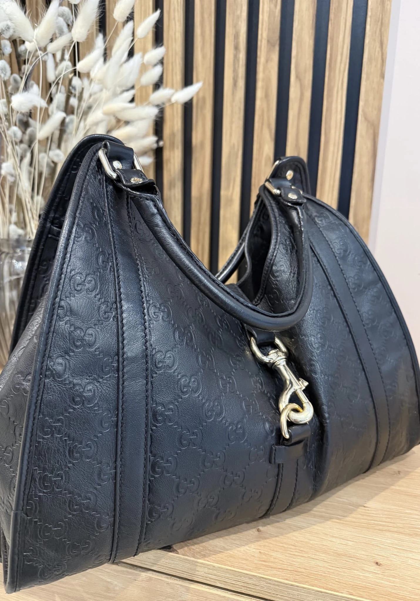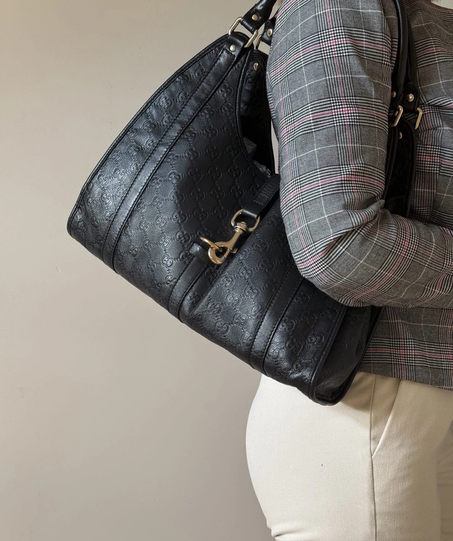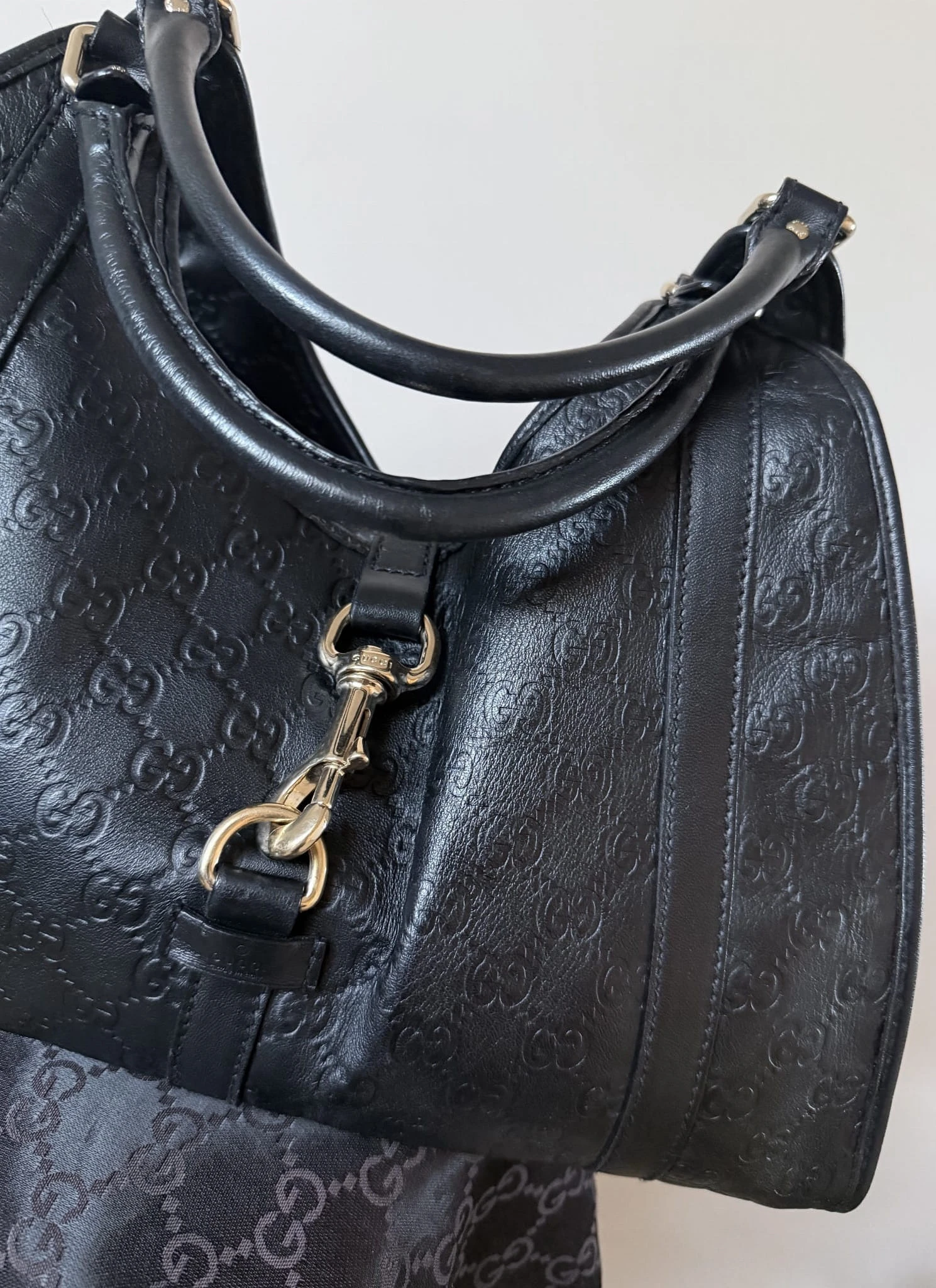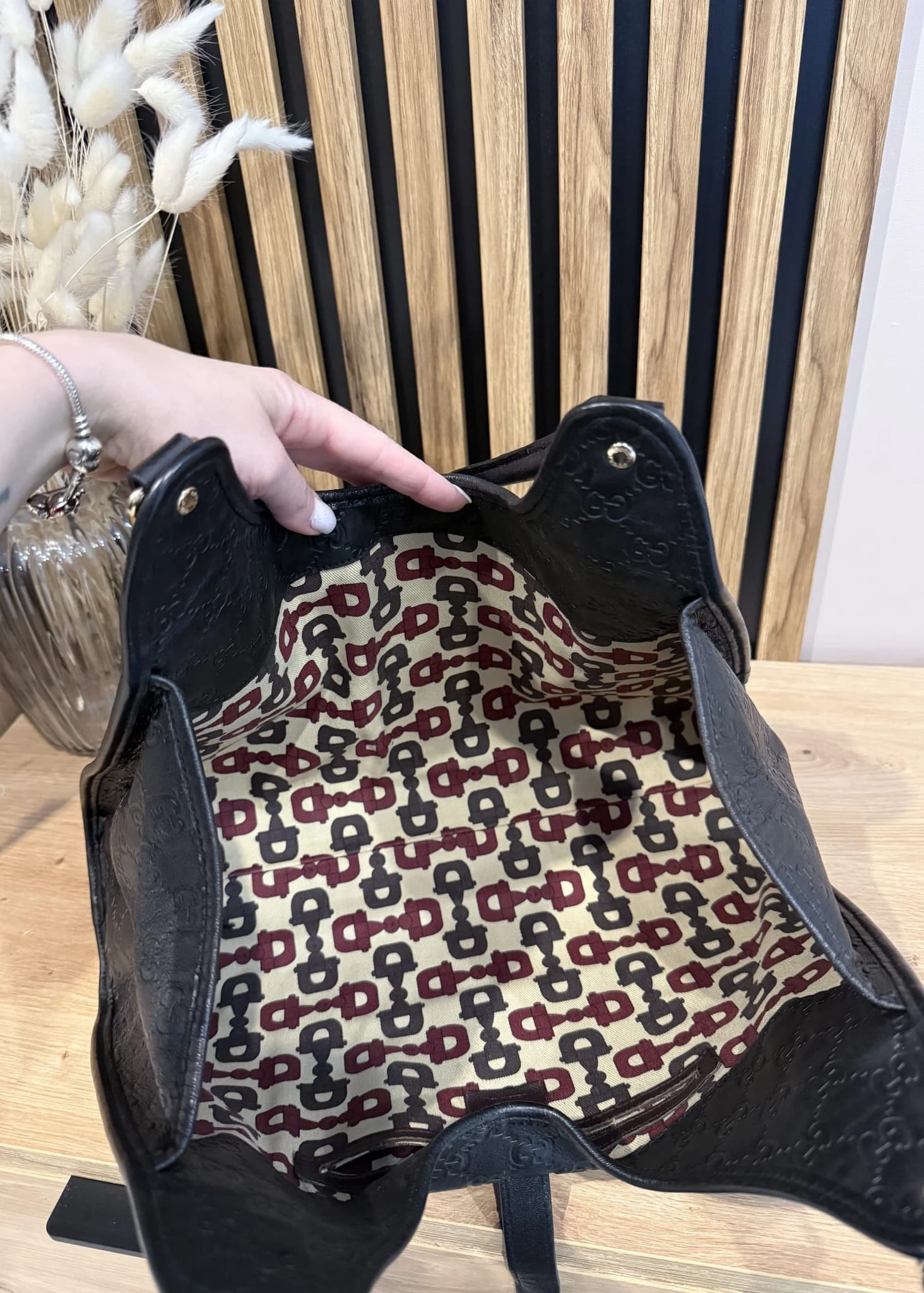 Elegancka, czarna torebka Gucci Jackie wykonana z miękkiej skóry o subtelnie tłoczonym wzorze monogramu guccissima. Jej klasyczny, półokrągły kształt nadaje jej ponadczasowego i wyrafinowano charakteru, a solidne, krótkie rączki zapewniają wygodę noszenia w dłoni lub na ramieniu. Skóra zachowana została w bardzo dobrym stanie, bez żadnych uszkodzeń czy otarć. Na przodzie robi się „zakładka”, natomiast nie jest to w żaden sposób uszkodzona skóra. Wnętrze zdobi podszewka ozdobiona wzorem inspirowanym końmi, który nawiązuje do dziedzictwa Gucci , marki założonej w 1921 roku. Torebka wyróżnia się charakterystycznym zapięciem z przodu, metalowe okucia są w złotym kolorze. Torebka jest w wygodnym rozmarz medium wraz z pokrowcem i certyfikatem autentyczności Entrupy.