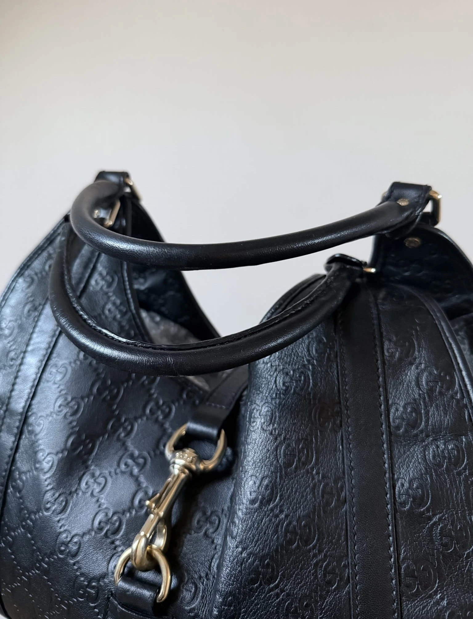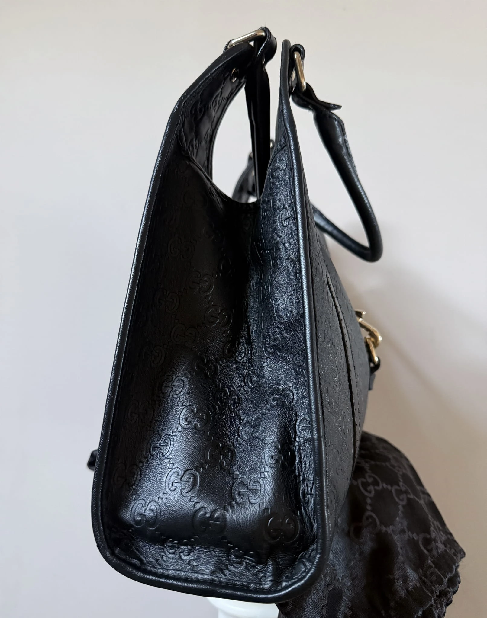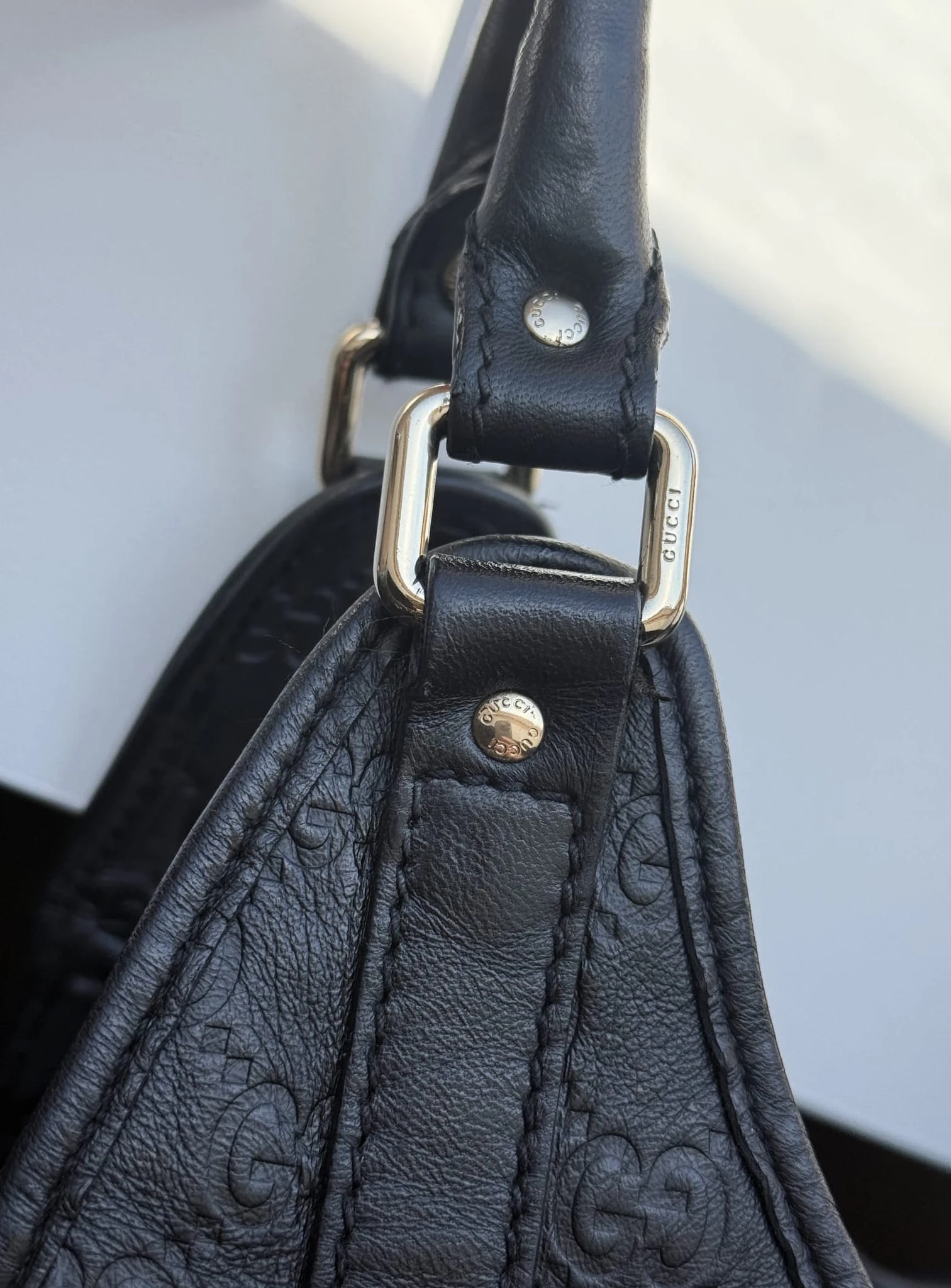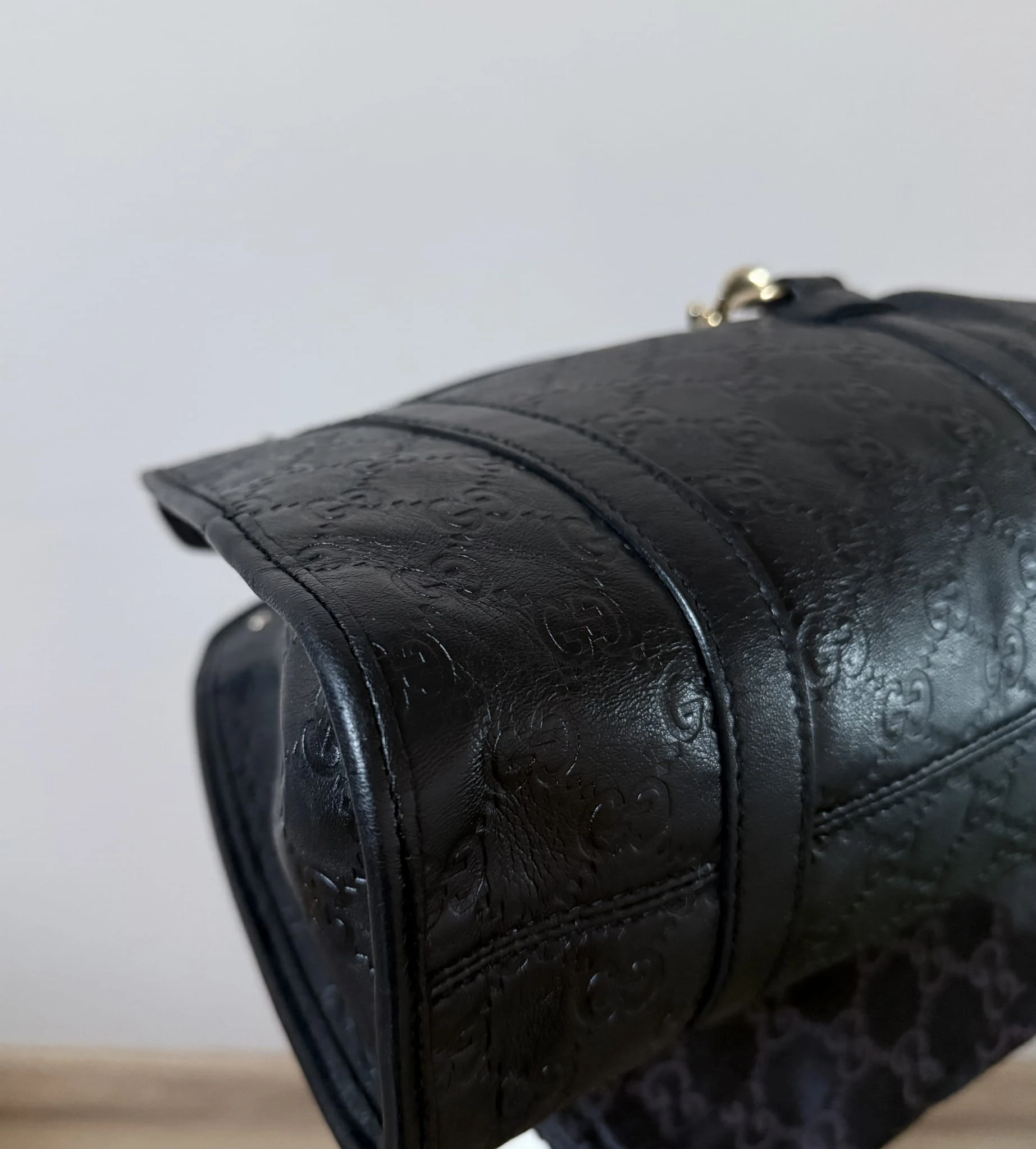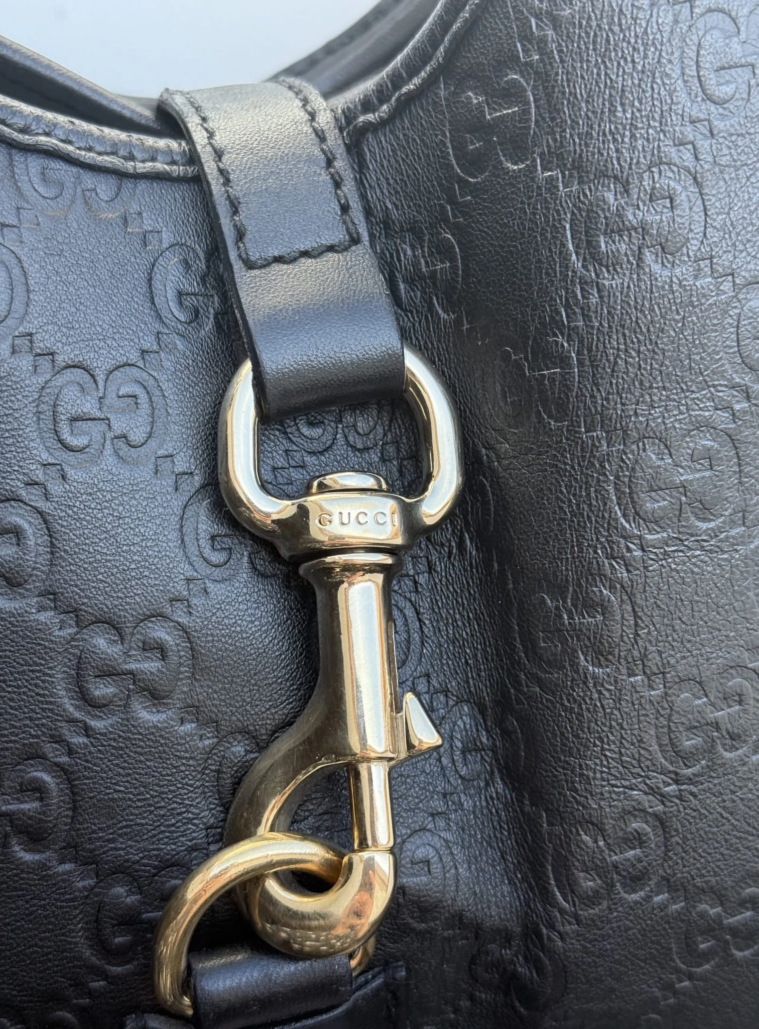 Elegancka, czarna torebka Gucci Jackie wykonana z miękkiej skóry o subtelnie tłoczonym wzorze monogramu guccissima. Jej klasyczny, półokrągły kształt nadaje jej ponadczasowego i wyrafinowano charakteru, a solidne, krótkie rączki zapewniają wygodę noszenia w dłoni lub na ramieniu. Skóra zachowana została w bardzo dobrym stanie, bez żadnych uszkodzeń czy otarć. Na przodzie robi się „zakładka”, natomiast nie jest to w żaden sposób uszkodzona skóra. Wnętrze zdobi podszewka ozdobiona wzorem inspirowanym końmi, który nawiązuje do dziedzictwa Gucci , marki założonej w 1921 roku. Torebka wyróżnia się charakterystycznym zapięciem z przodu, metalowe okucia są w złotym kolorze. Torebka jest w wygodnym rozmarz medium wraz z pokrowcem i certyfikatem autentyczności Entrupy.