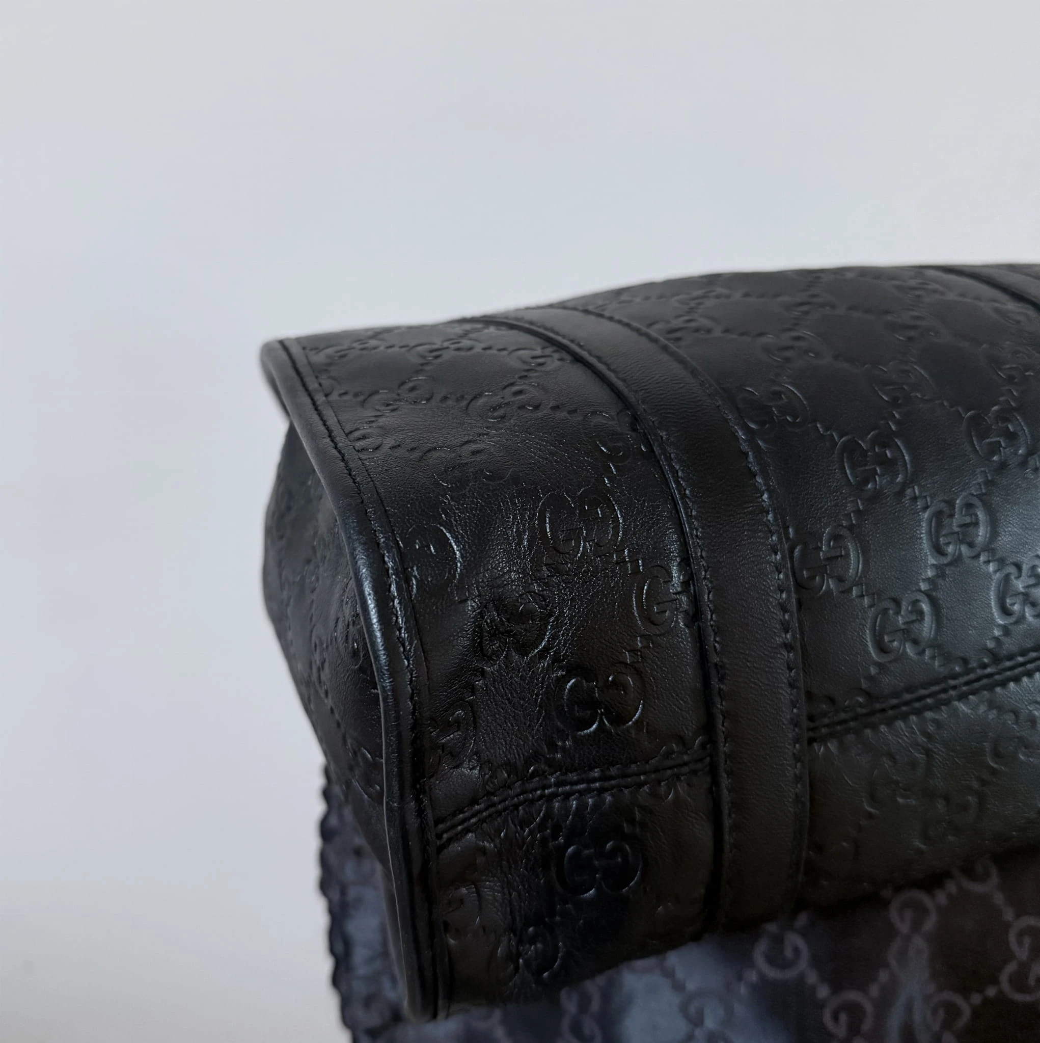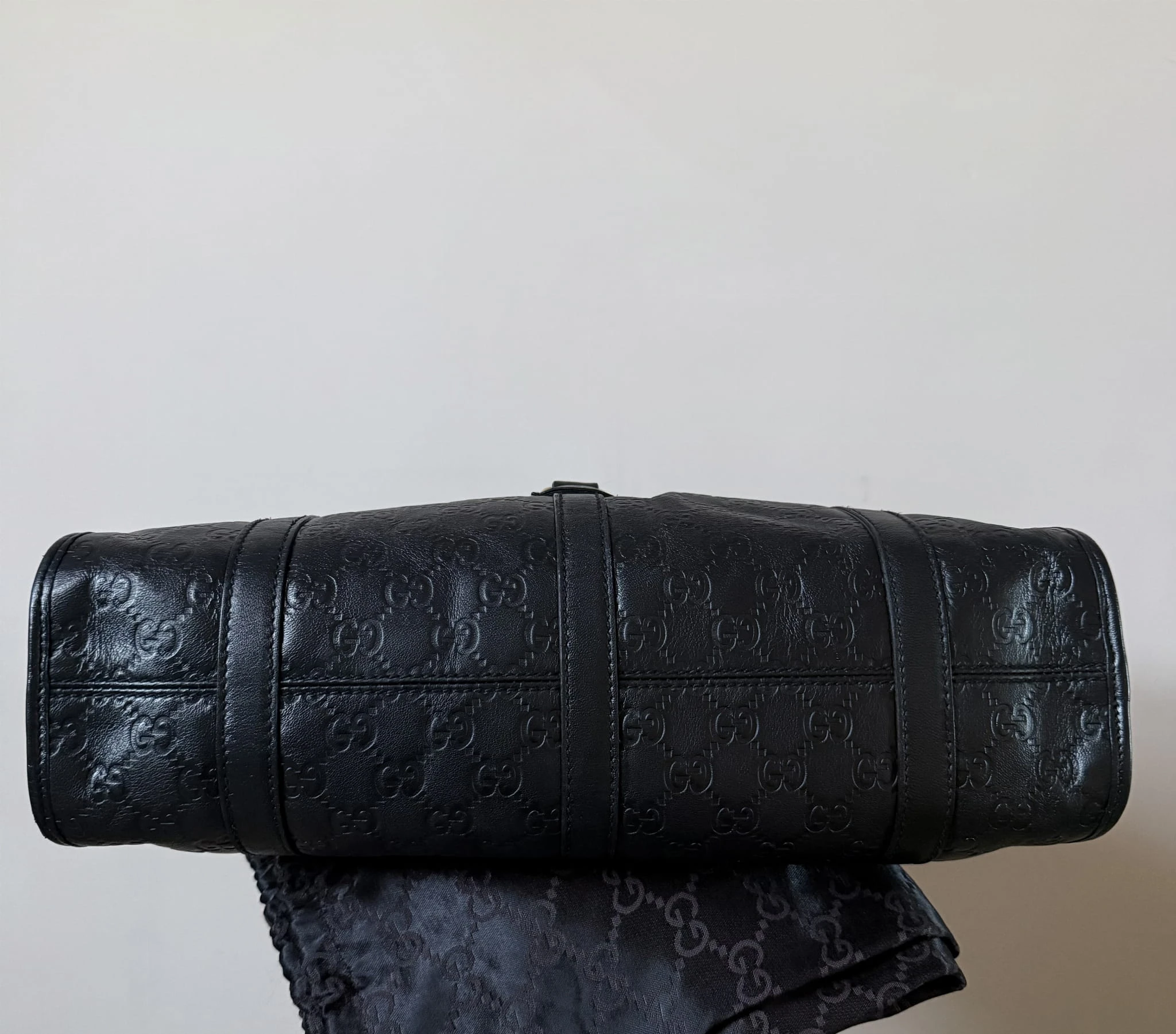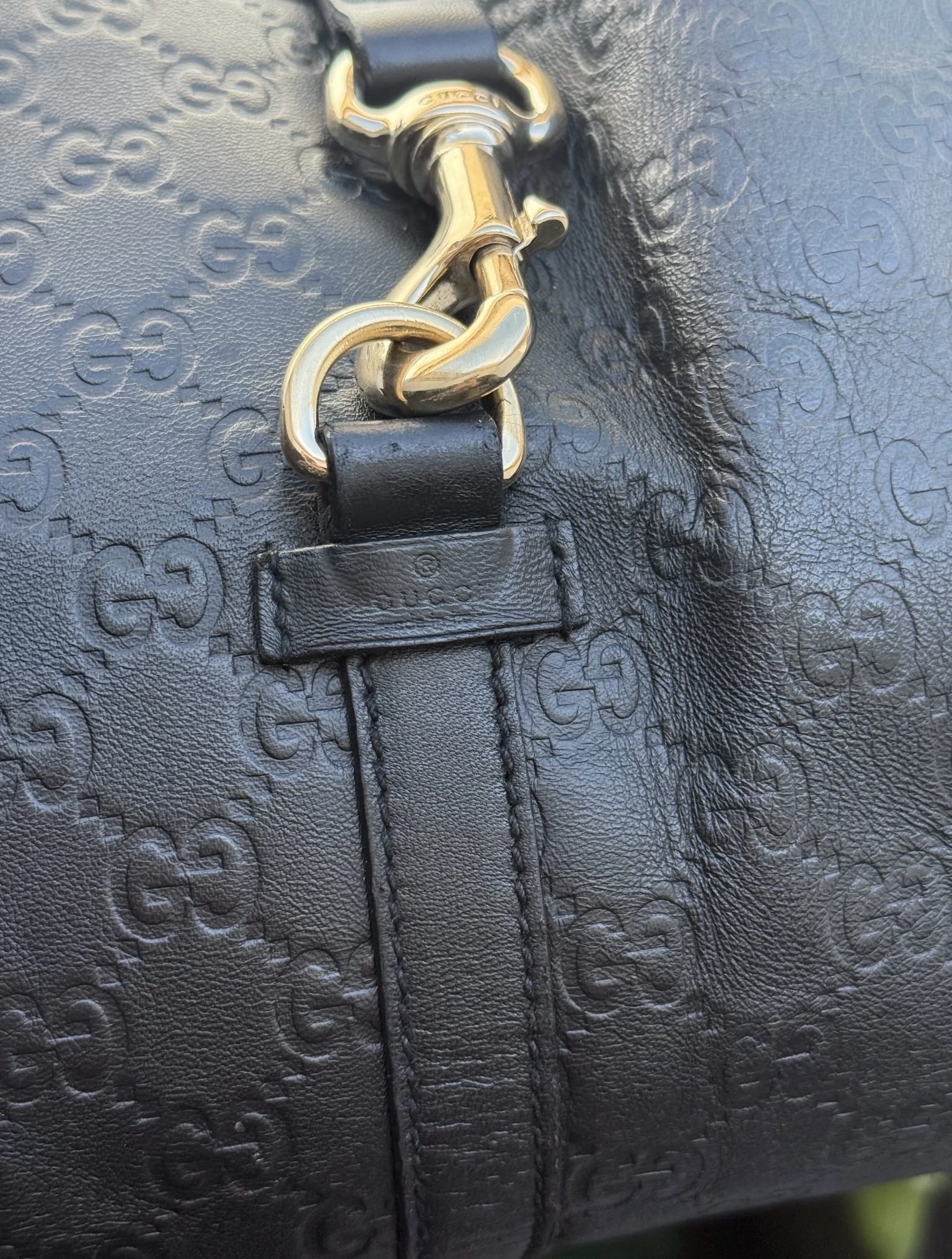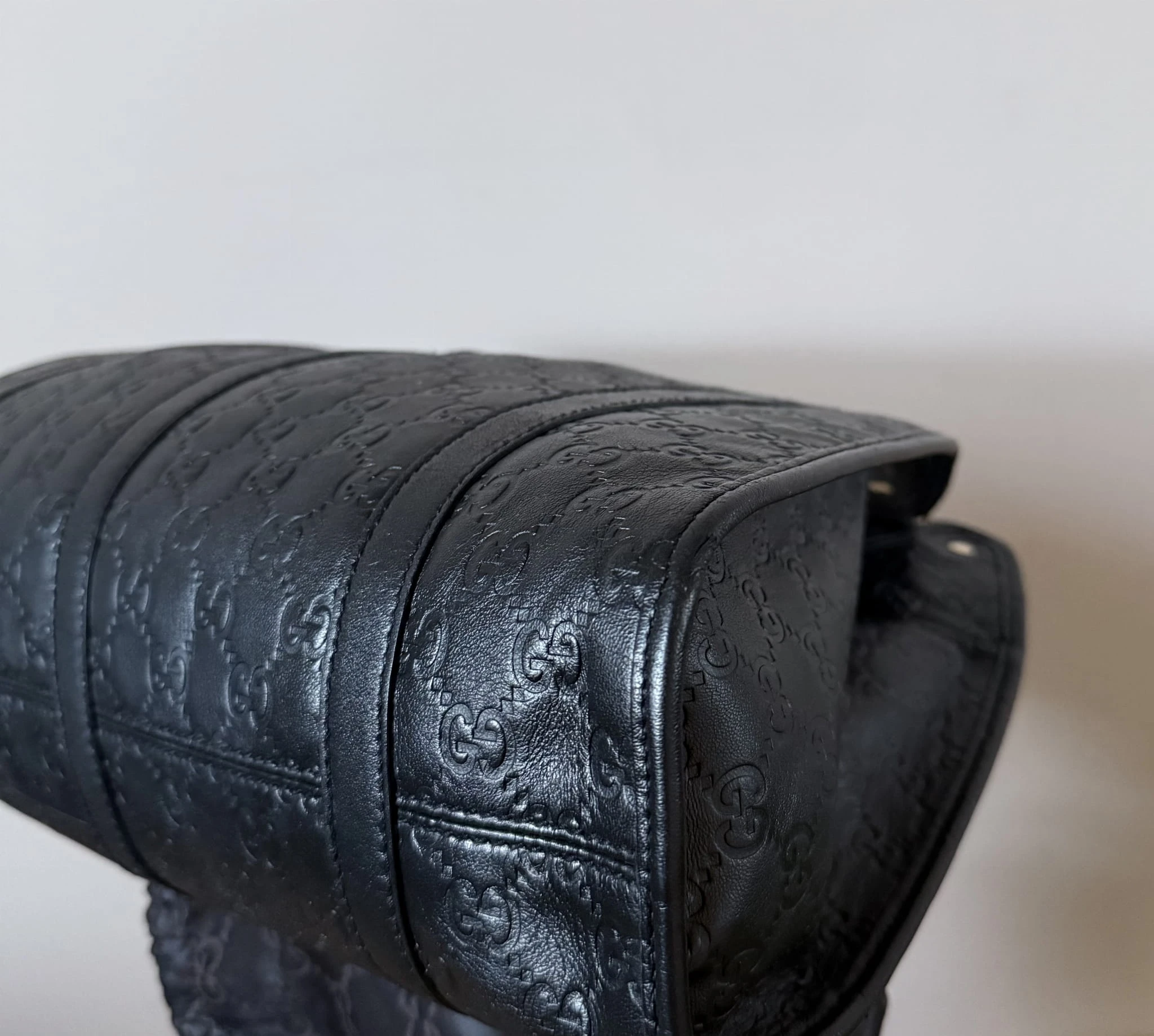 Elegancka, czarna torebka Gucci Jackie wykonana z miękkiej skóry o subtelnie tłoczonym wzorze monogramu guccissima. Jej klasyczny, półokrągły kształt nadaje jej ponadczasowego i wyrafinowano charakteru, a solidne, krótkie rączki zapewniają wygodę noszenia w dłoni lub na ramieniu. Skóra zachowana została w bardzo dobrym stanie, bez żadnych uszkodzeń czy otarć. Na przodzie robi się „zakładka”, natomiast nie jest to w żaden sposób uszkodzona skóra. Wnętrze zdobi podszewka ozdobiona wzorem inspirowanym końmi, który nawiązuje do dziedzictwa Gucci , marki założonej w 1921 roku. Torebka wyróżnia się charakterystycznym zapięciem z przodu, metalowe okucia są w złotym kolorze. Torebka jest w wygodnym rozmarz medium wraz z pokrowcem i certyfikatem autentyczności Entrupy.