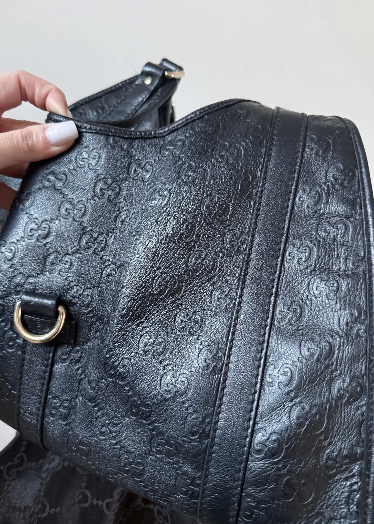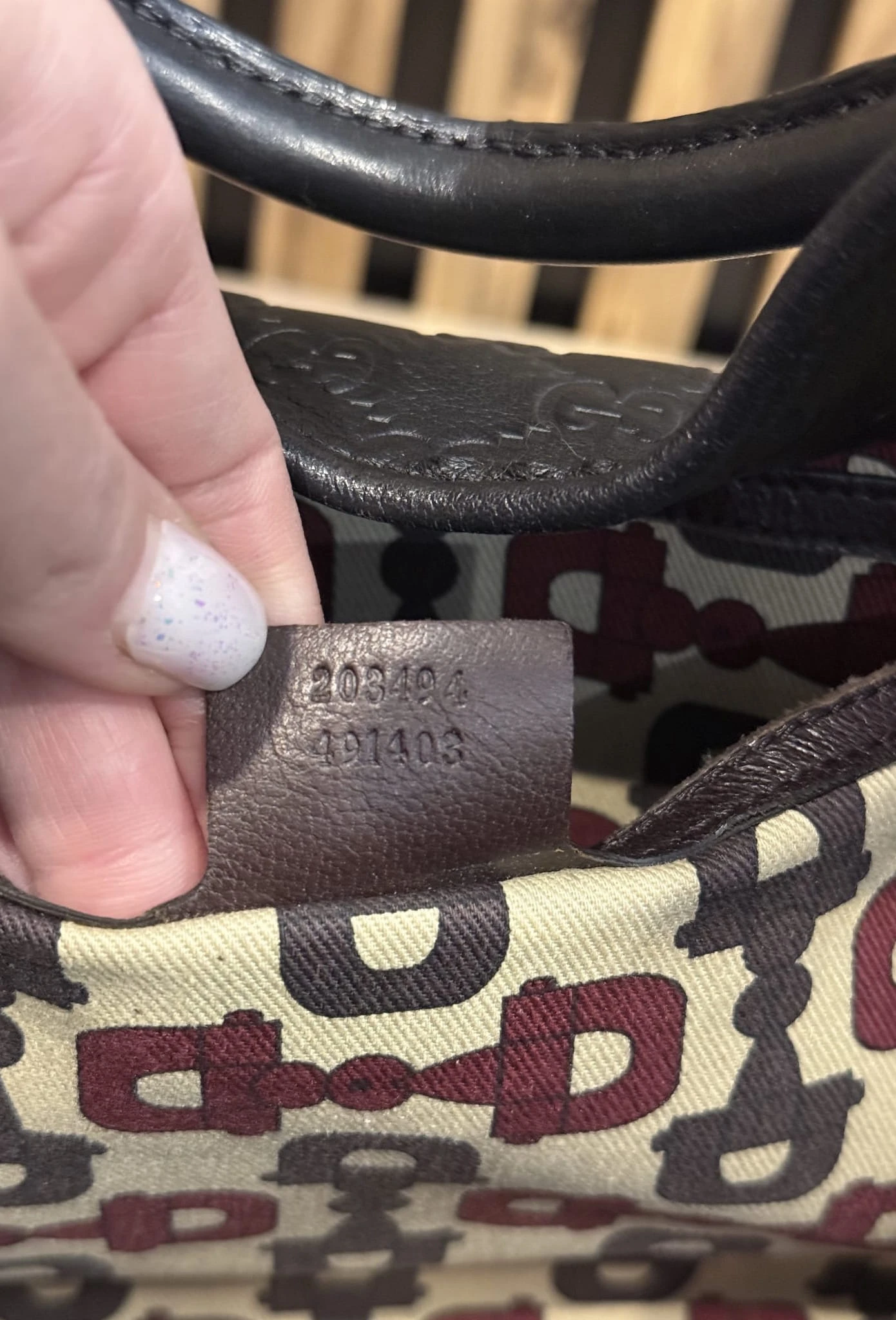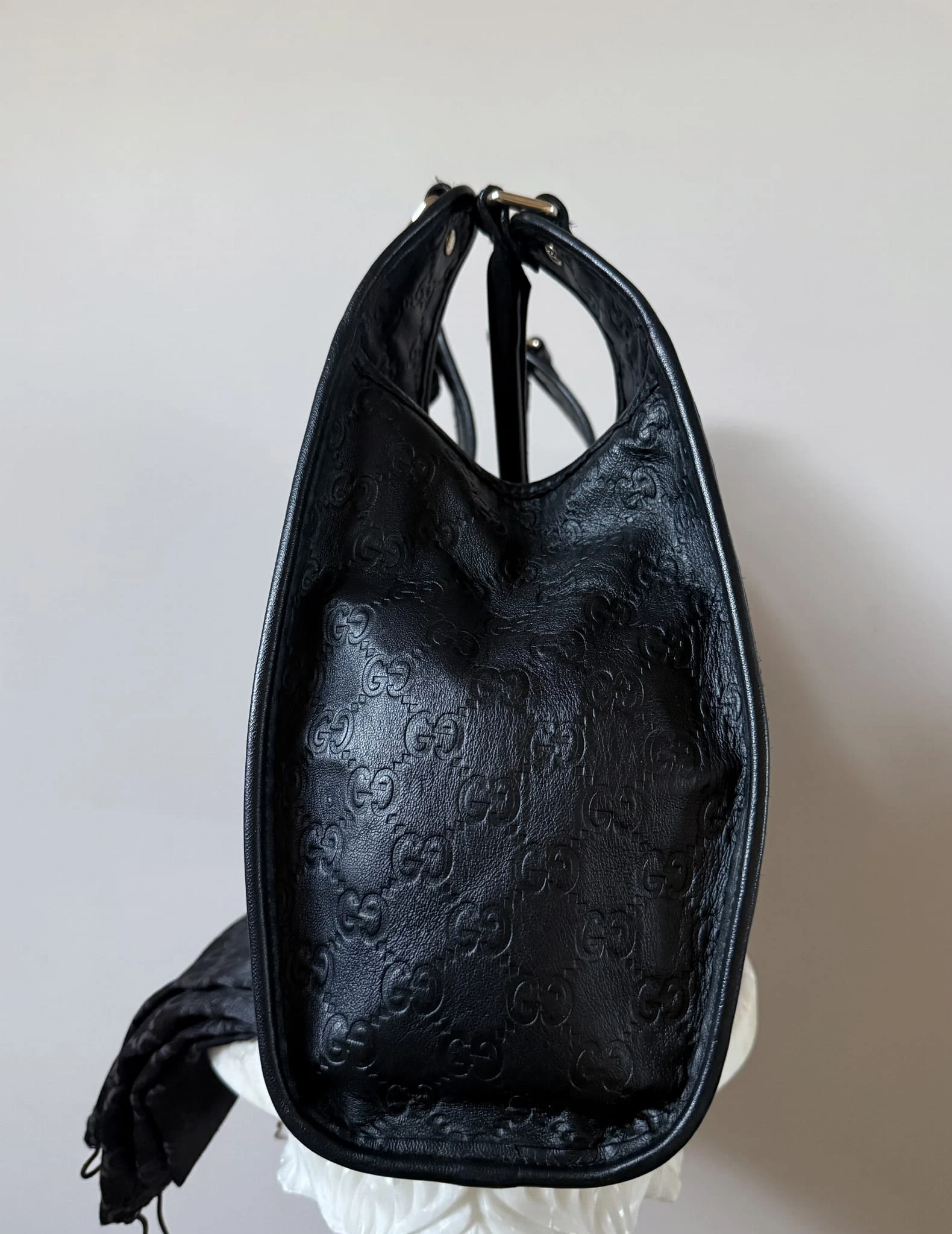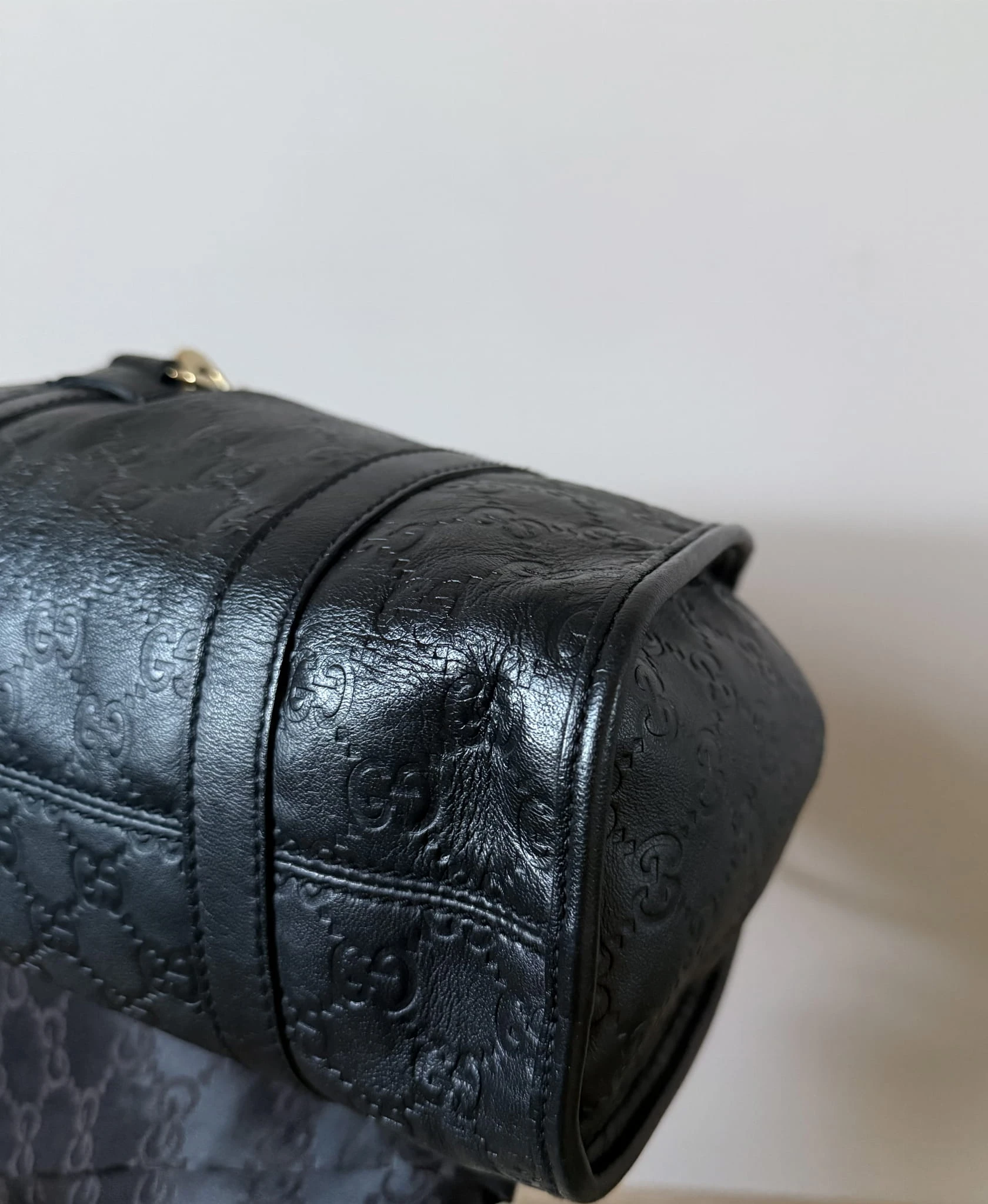 Elegancka, czarna torebka Gucci Jackie wykonana z miękkiej skóry o subtelnie tłoczonym wzorze monogramu guccissima. Jej klasyczny, półokrągły kształt nadaje jej ponadczasowego i wyrafinowano charakteru, a solidne, krótkie rączki zapewniają wygodę noszenia w dłoni lub na ramieniu. Skóra zachowana została w bardzo dobrym stanie, bez żadnych uszkodzeń czy otarć. Na przodzie robi się „zakładka”, natomiast nie jest to w żaden sposób uszkodzona skóra. Wnętrze zdobi podszewka ozdobiona wzorem inspirowanym końmi, który nawiązuje do dziedzictwa Gucci , marki założonej w 1921 roku. Torebka wyróżnia się charakterystycznym zapięciem z przodu, metalowe okucia są w złotym kolorze. Torebka jest w wygodnym rozmarz medium wraz z pokrowcem i certyfikatem autentyczności Entrupy.