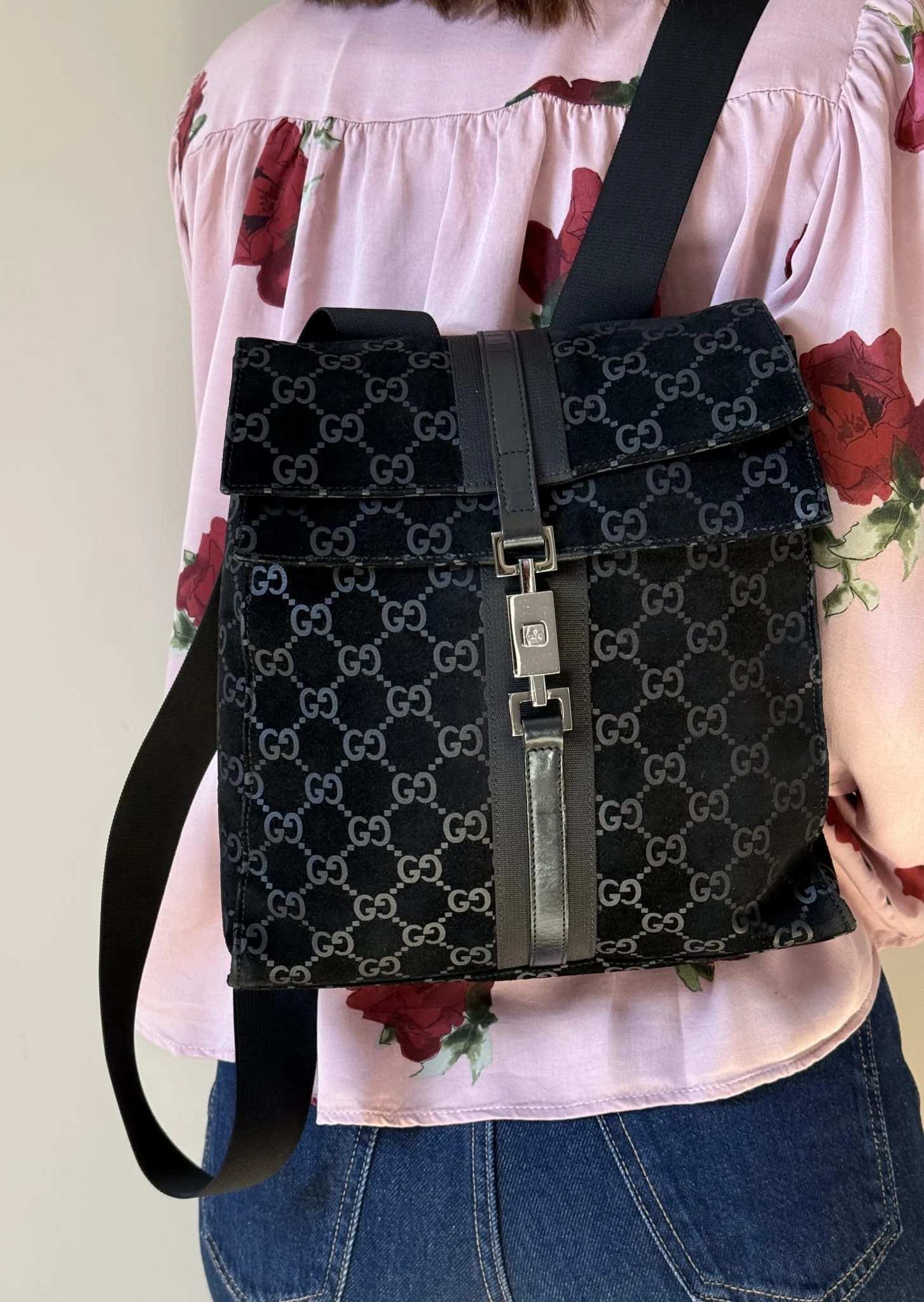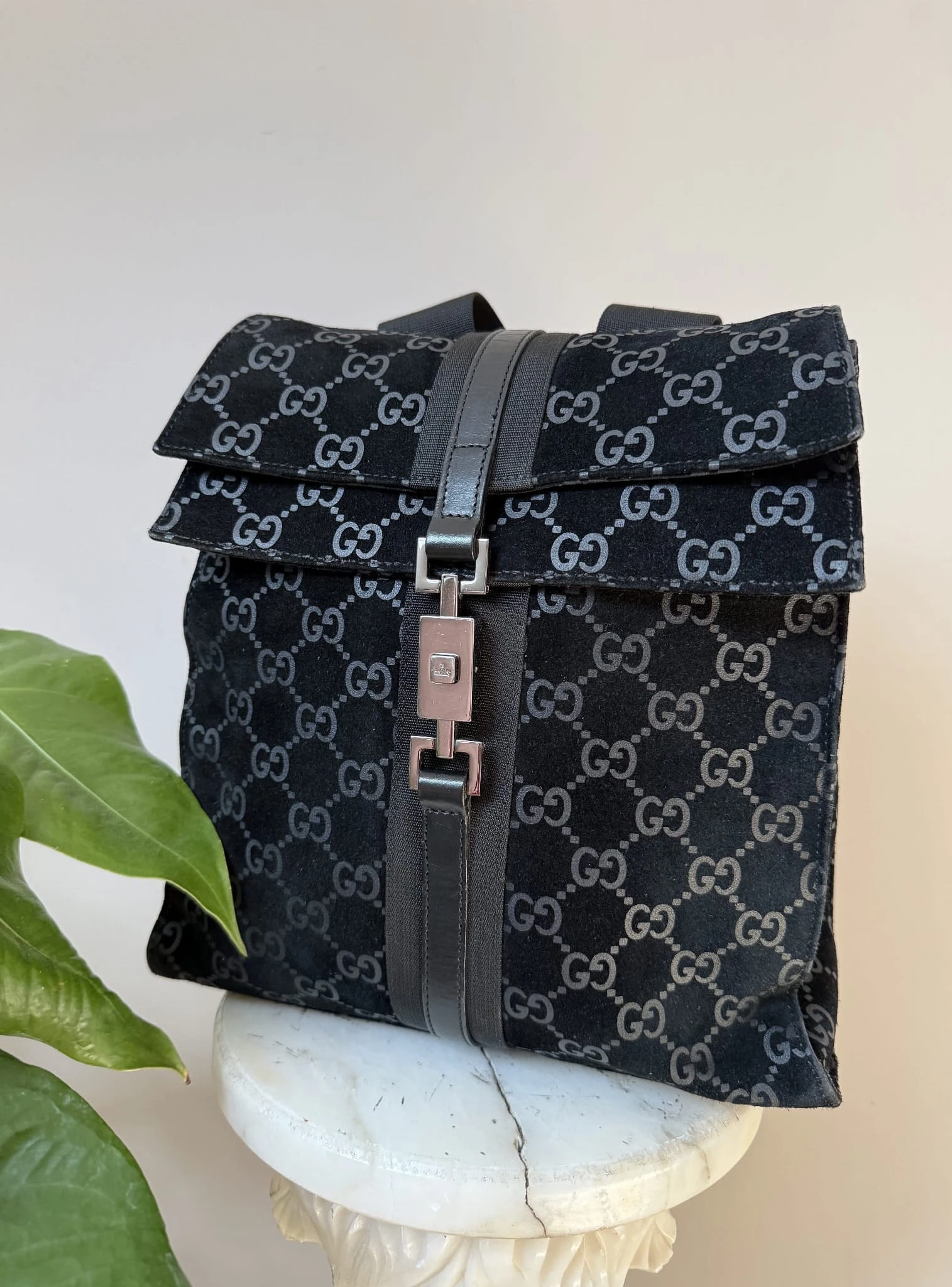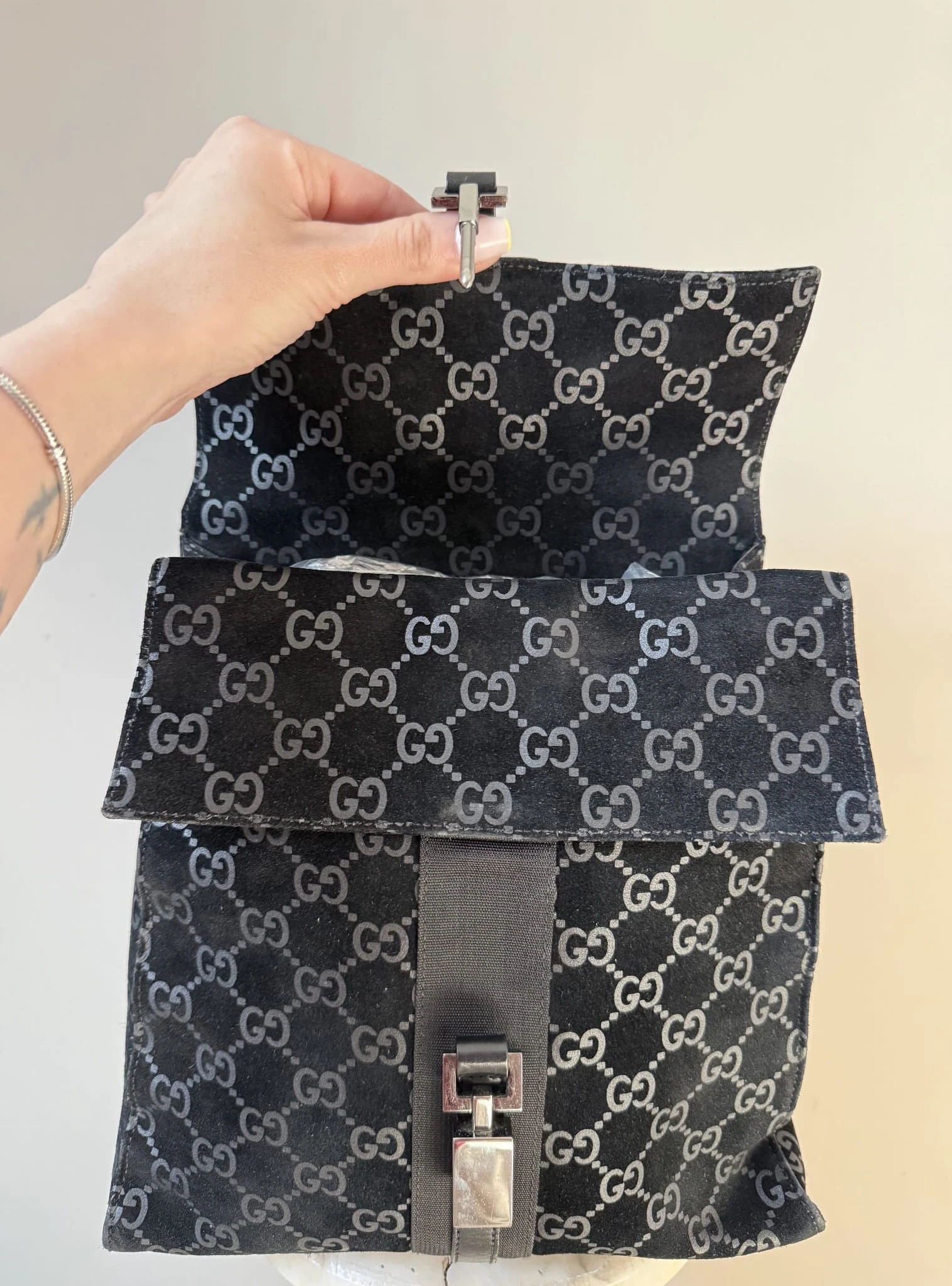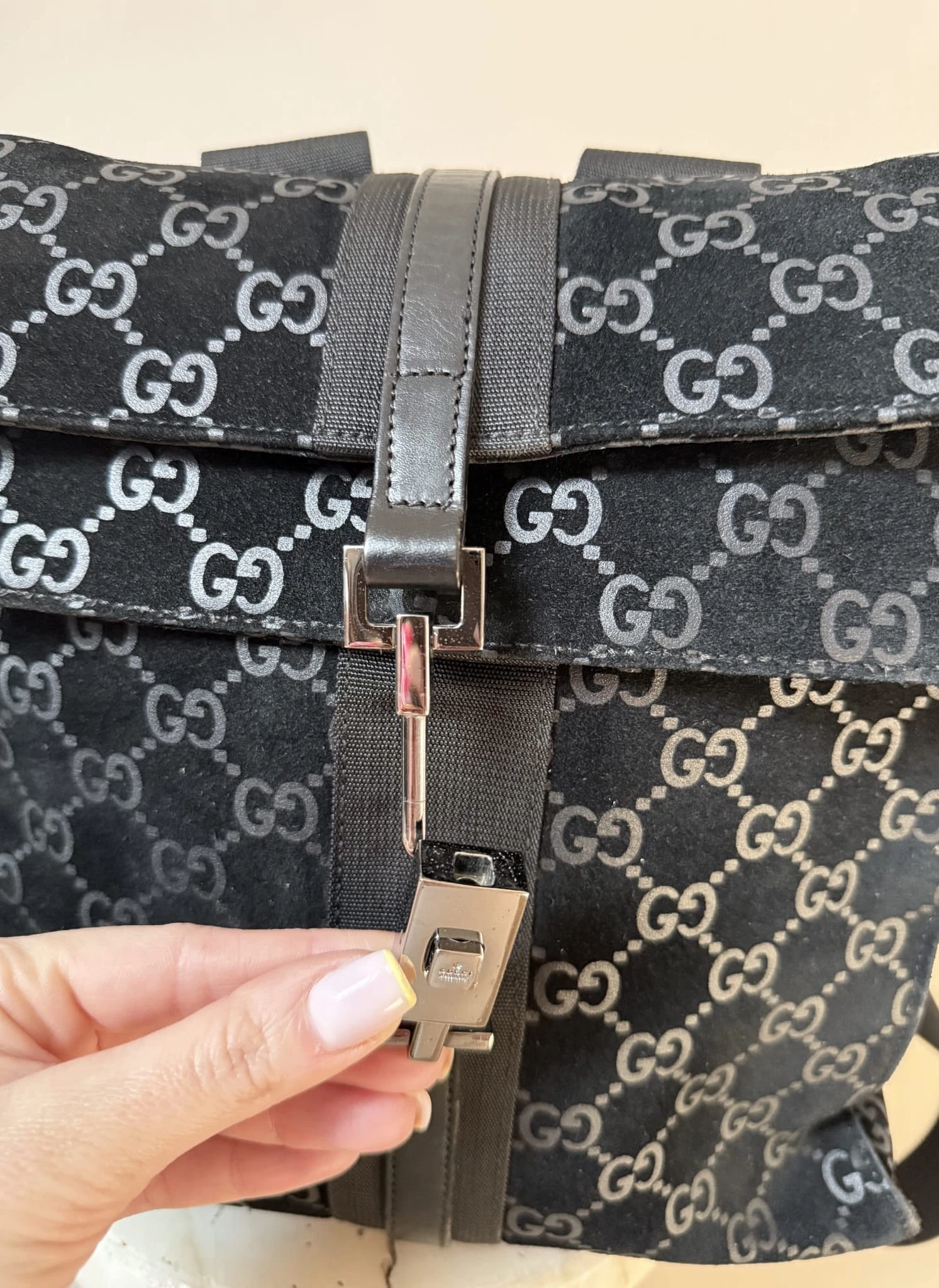Unikatowy plecak marki Gucci wykonany z czarnego zamszu z monogramem „GG”. Model wyróżnia się minimalistycznym, a zarazem eleganckim designem, który świetnie łączy funkcjonalność z luksusowym wyglądem. Model Gucci Jackie nie jest często spotykany na rynku wtórnym.