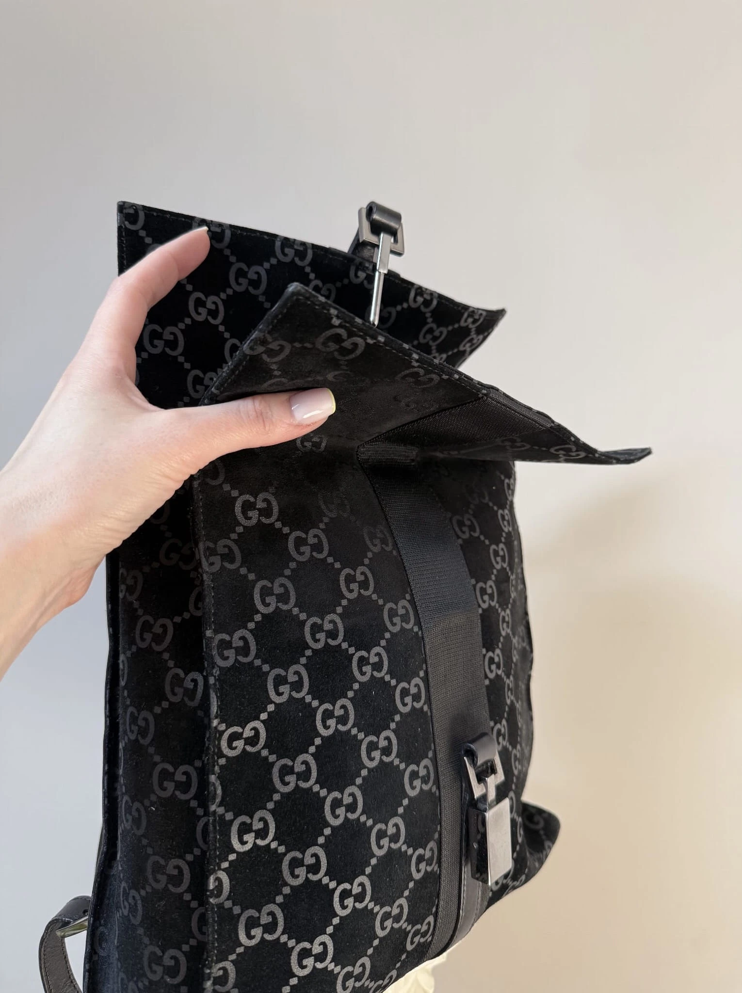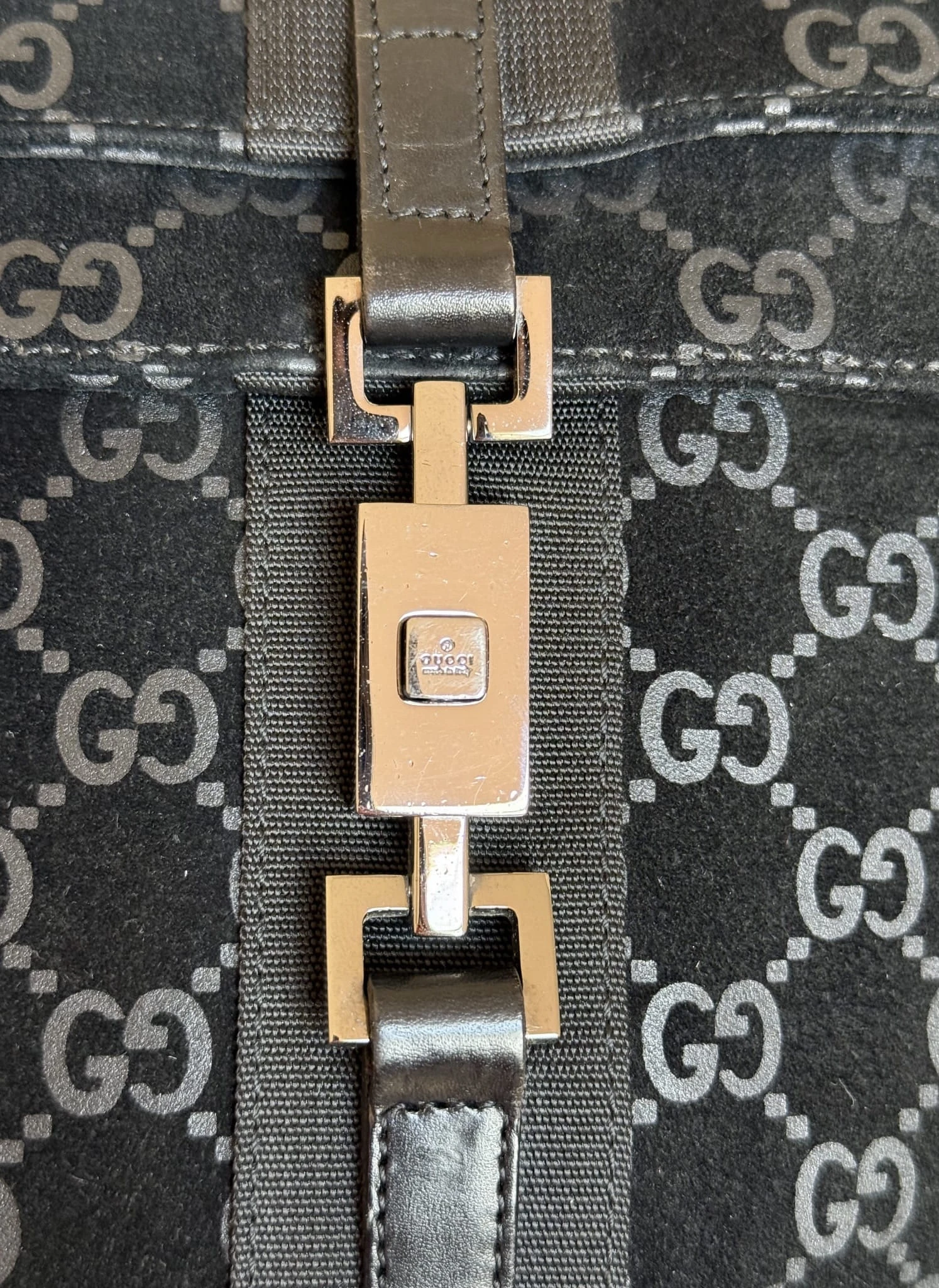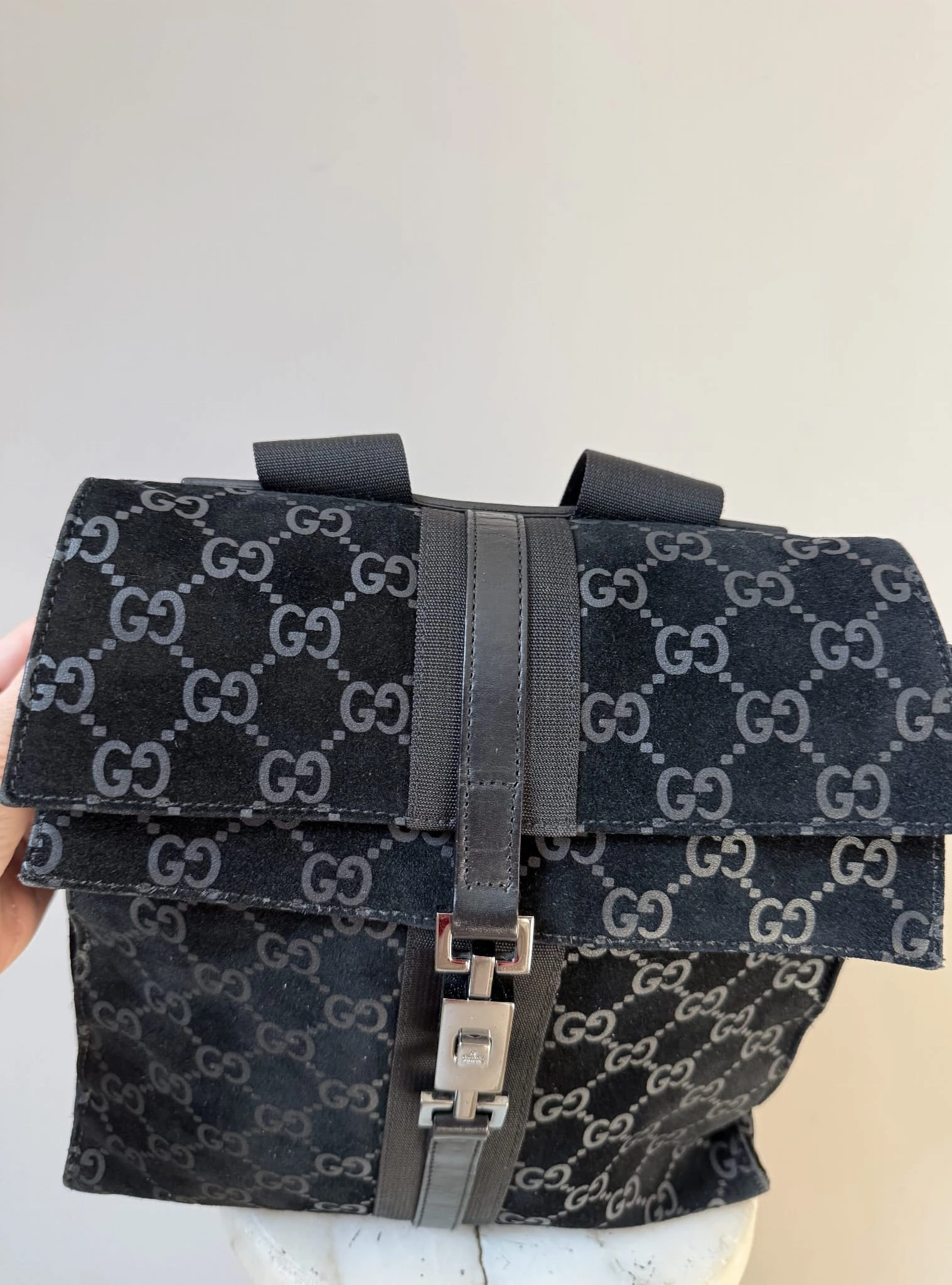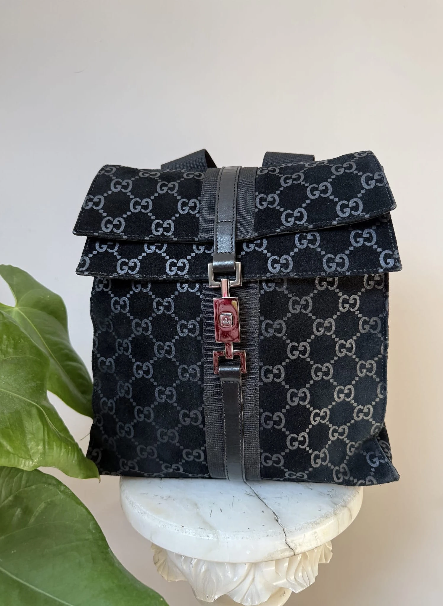 Unikatowy plecak marki Gucci wykonany z czarnego zamszu z monogramem „GG”. Model wyróżnia się minimalistycznym, a zarazem eleganckim designem, który świetnie łączy funkcjonalność z luksusowym wyglądem. Model Gucci Jackie nie jest często spotykany na rynku wtórnym.