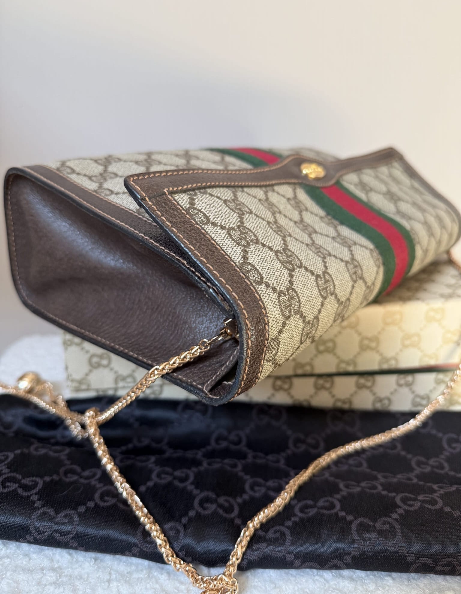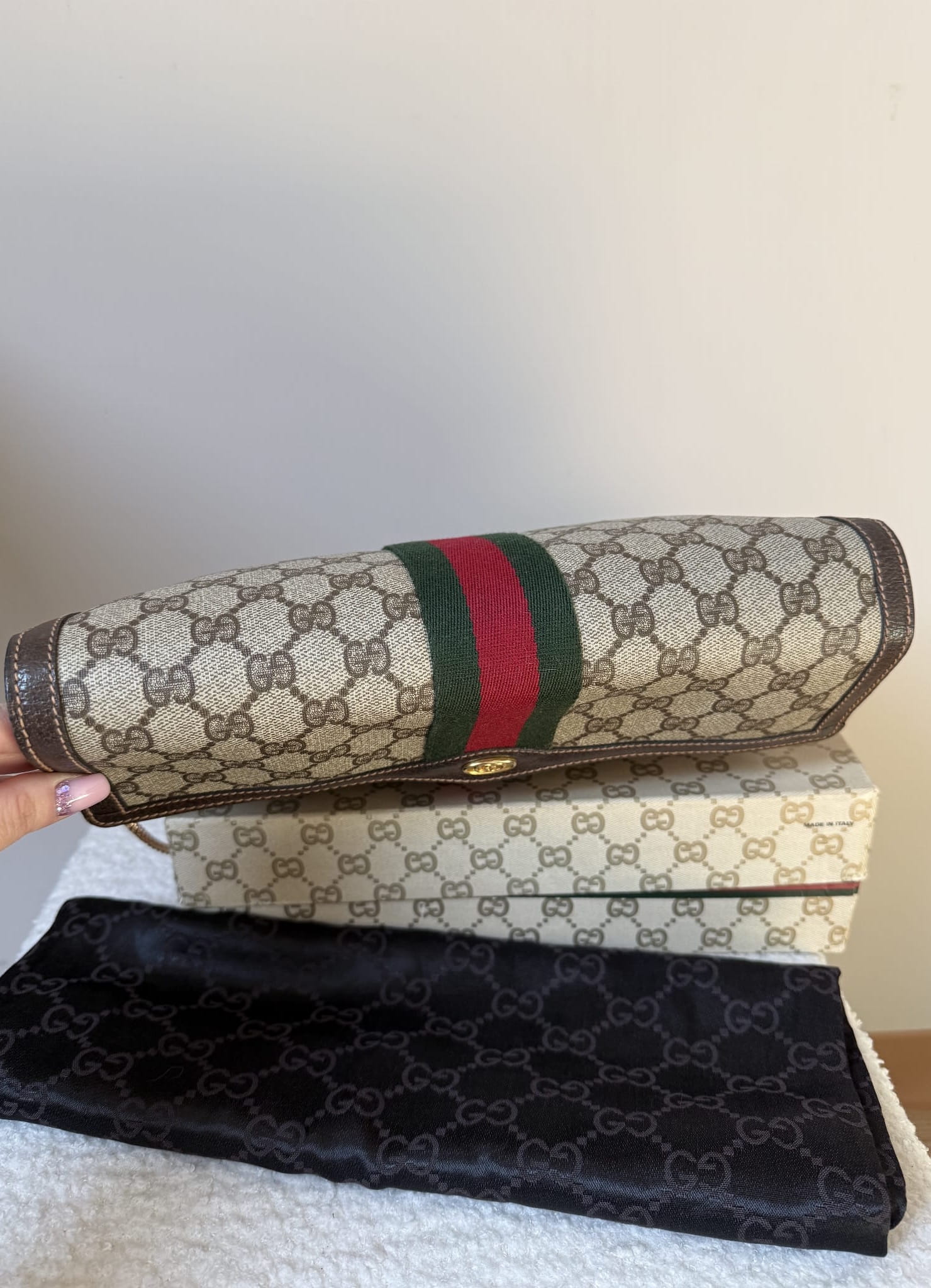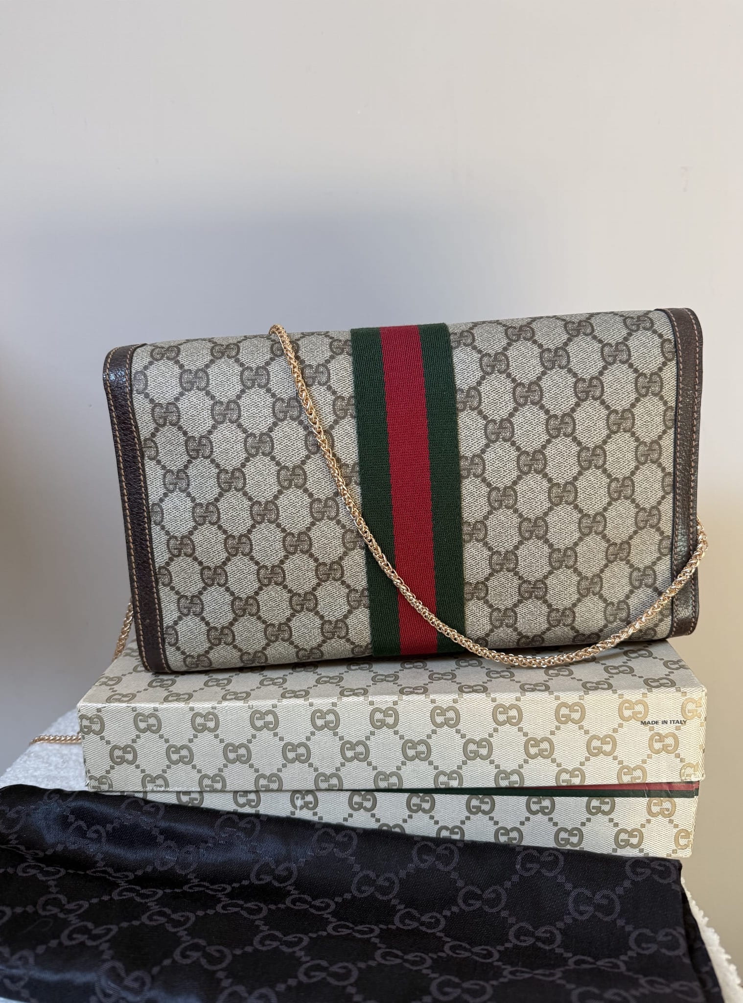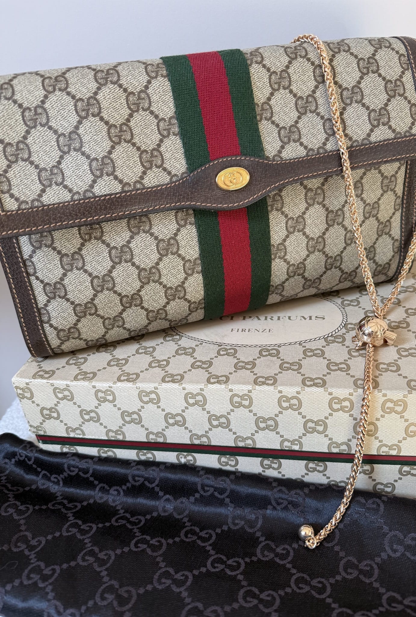 Klasyczna, ponadczasowa kopertówka Gucci z workiem przeciwkurzowym i pudełkiem