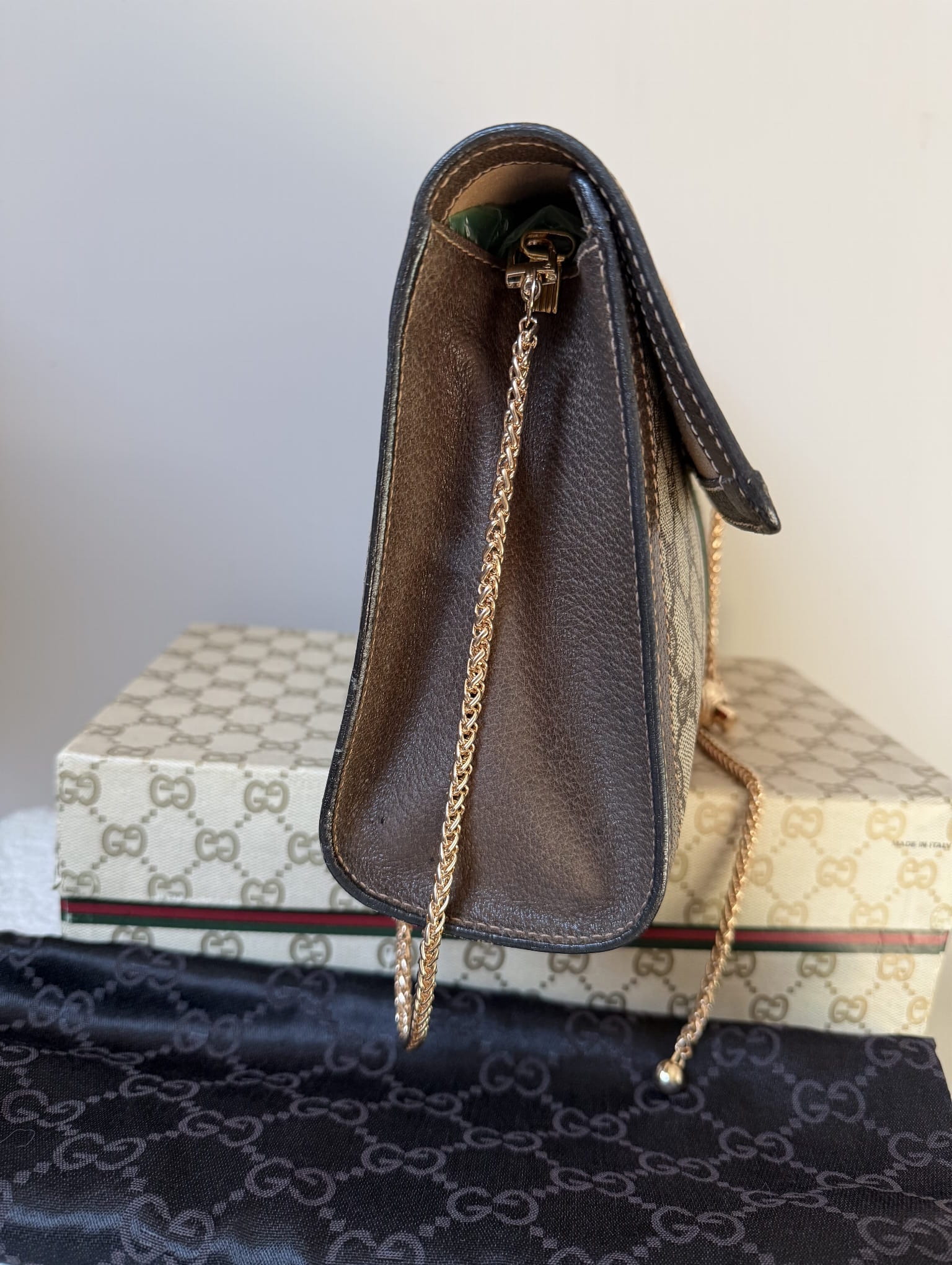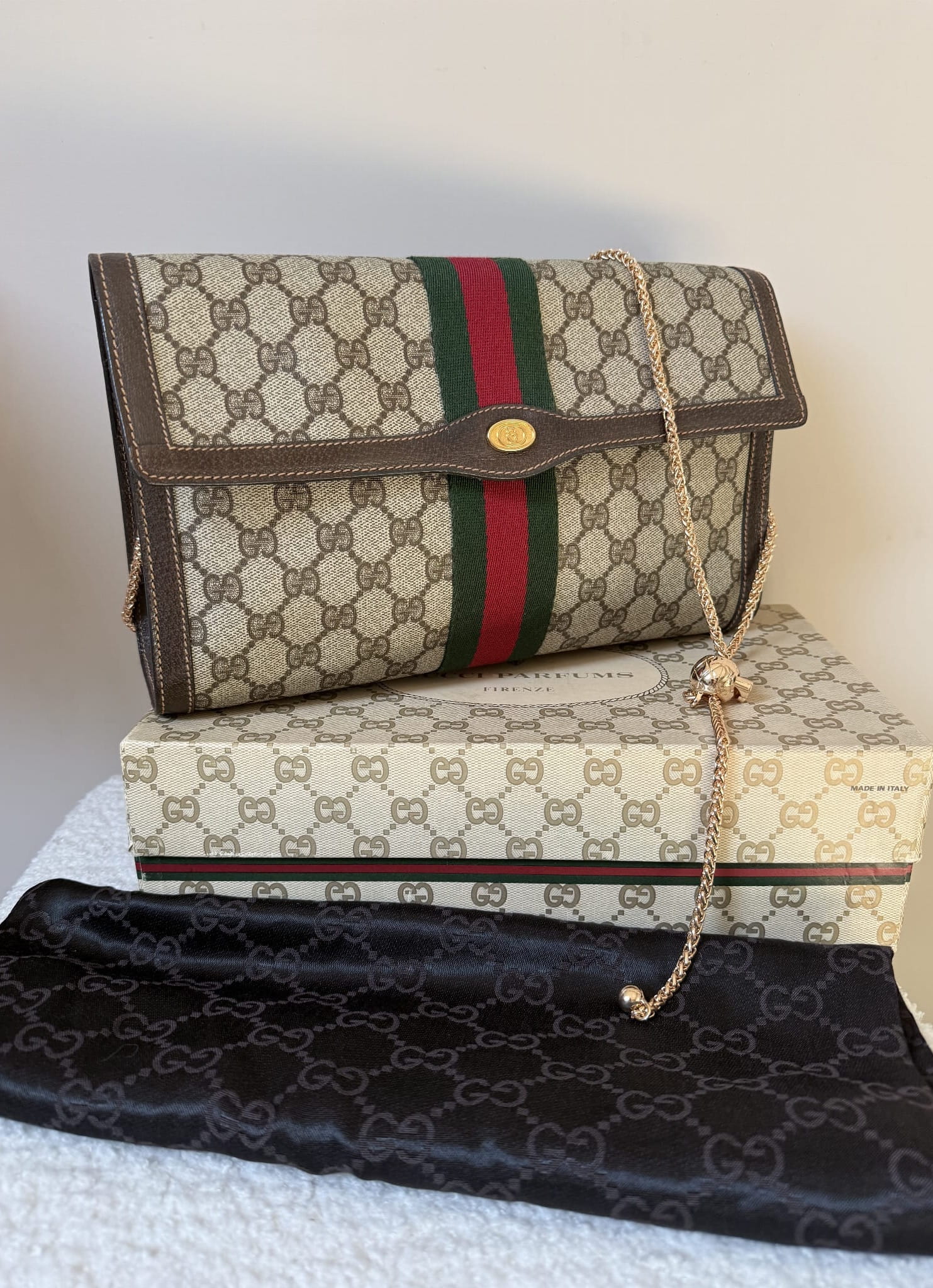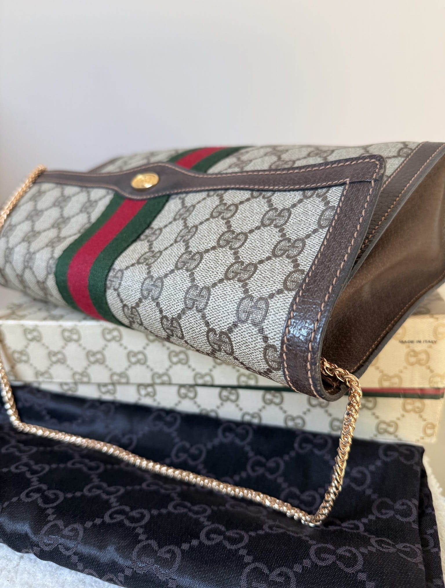 Klasyczna, ponadczasowa kopertówka Gucci z workiem przeciwkurzowym i pudełkiem