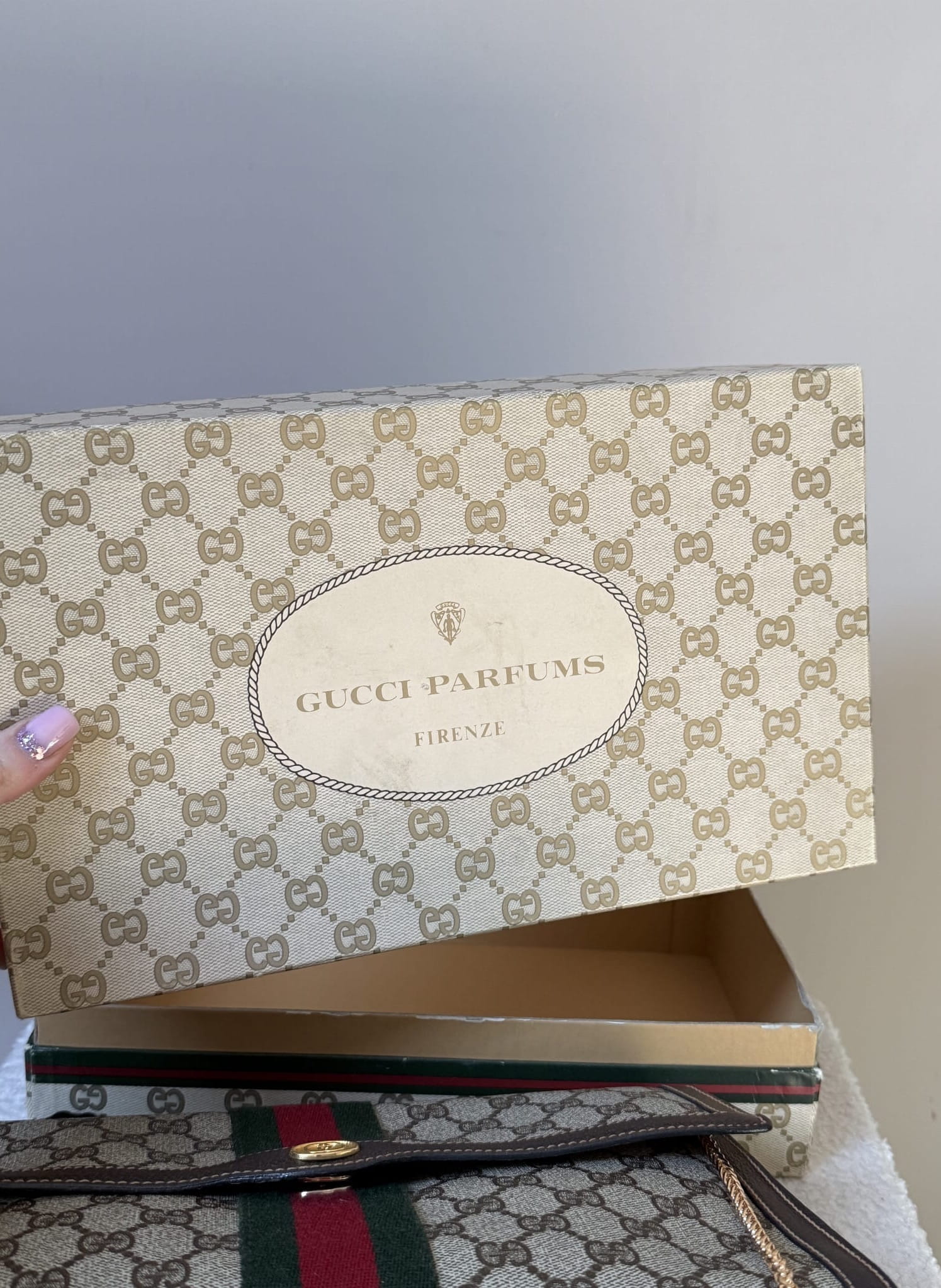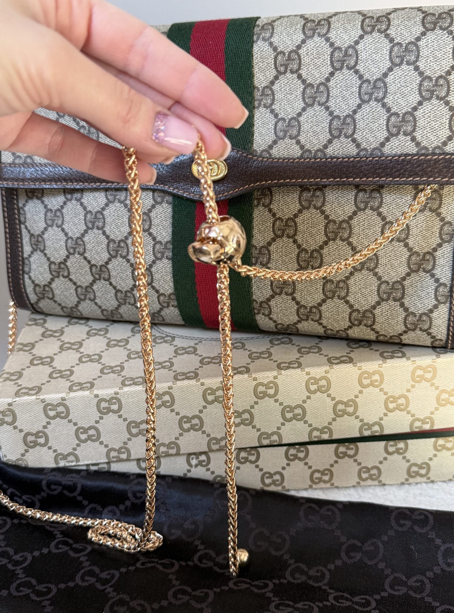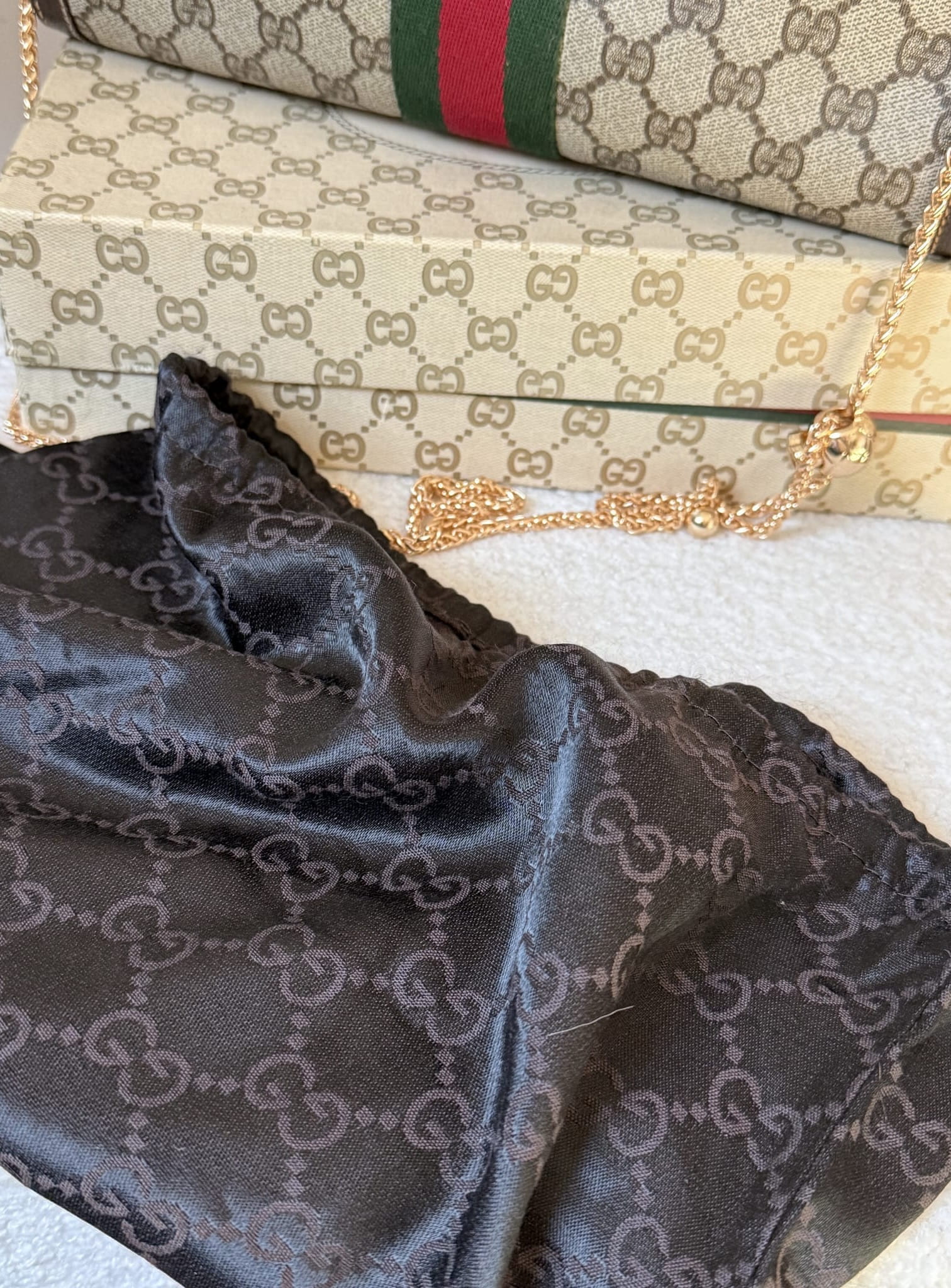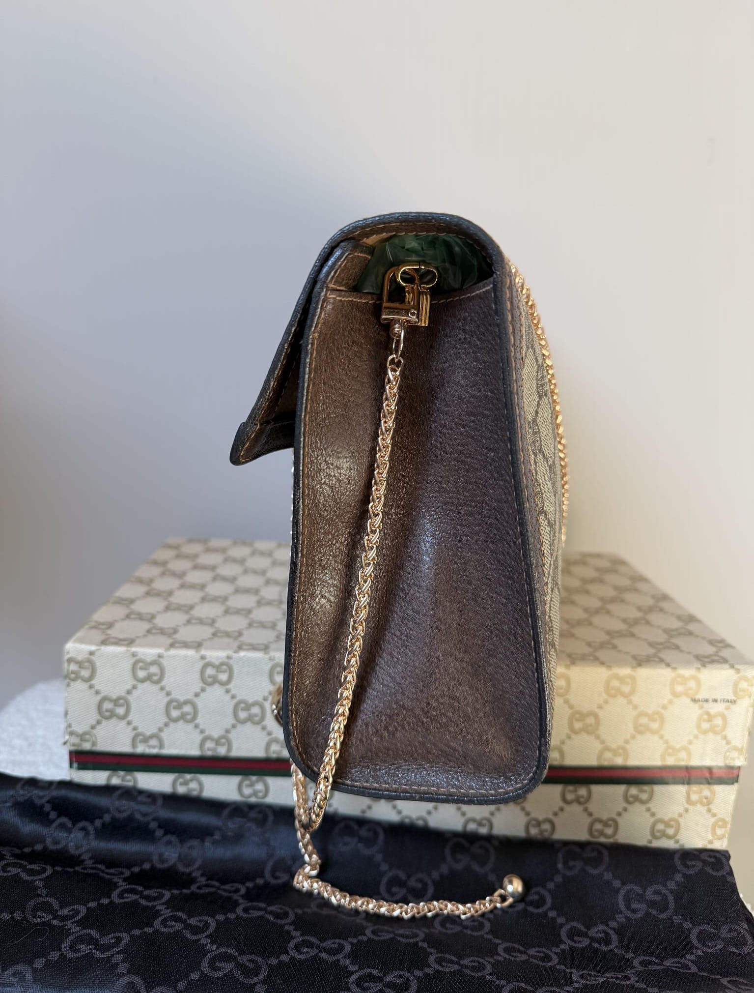 Klasyczna, ponadczasowa kopertówka Gucci z workiem przeciwkurzowym i pudełkiem