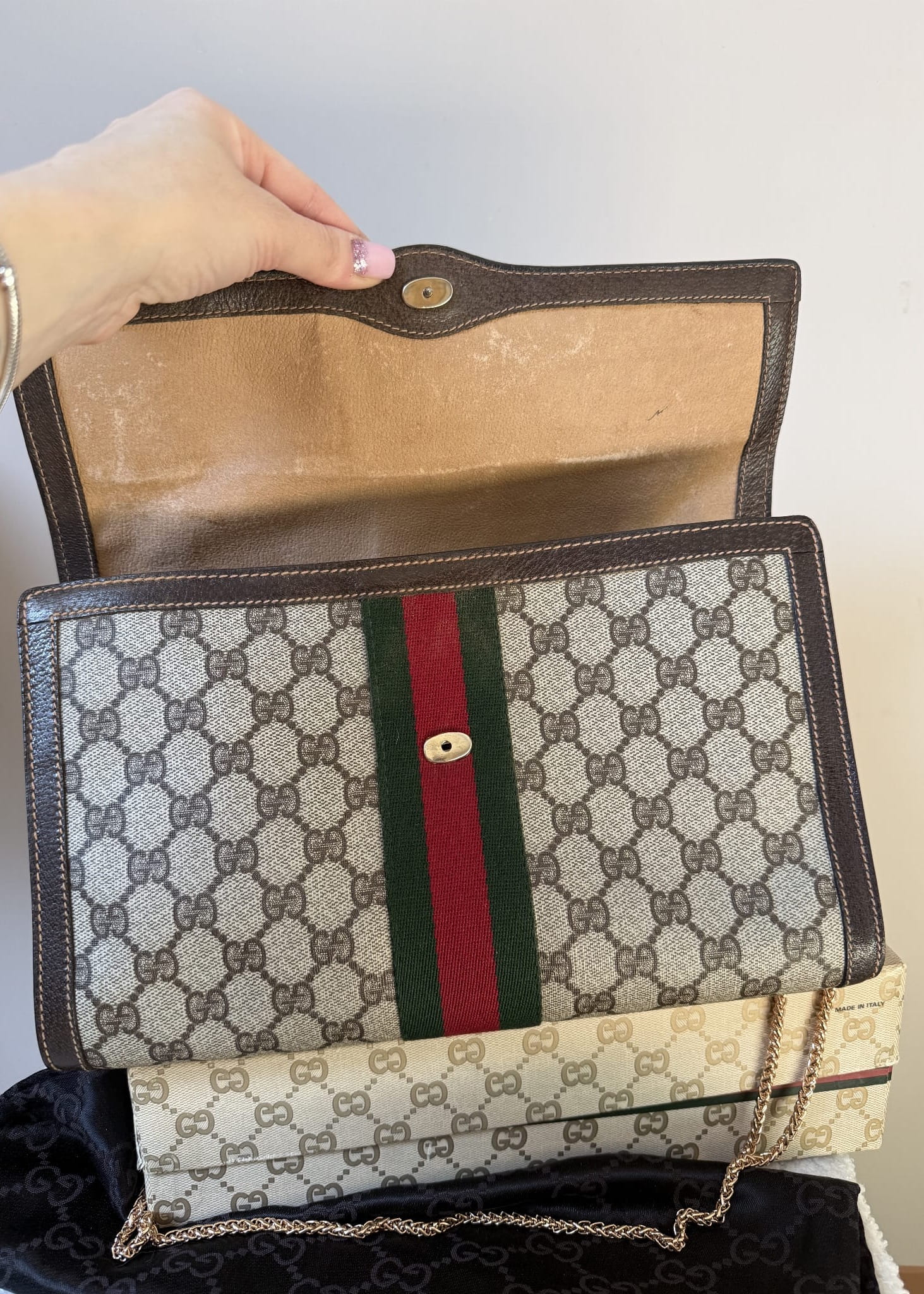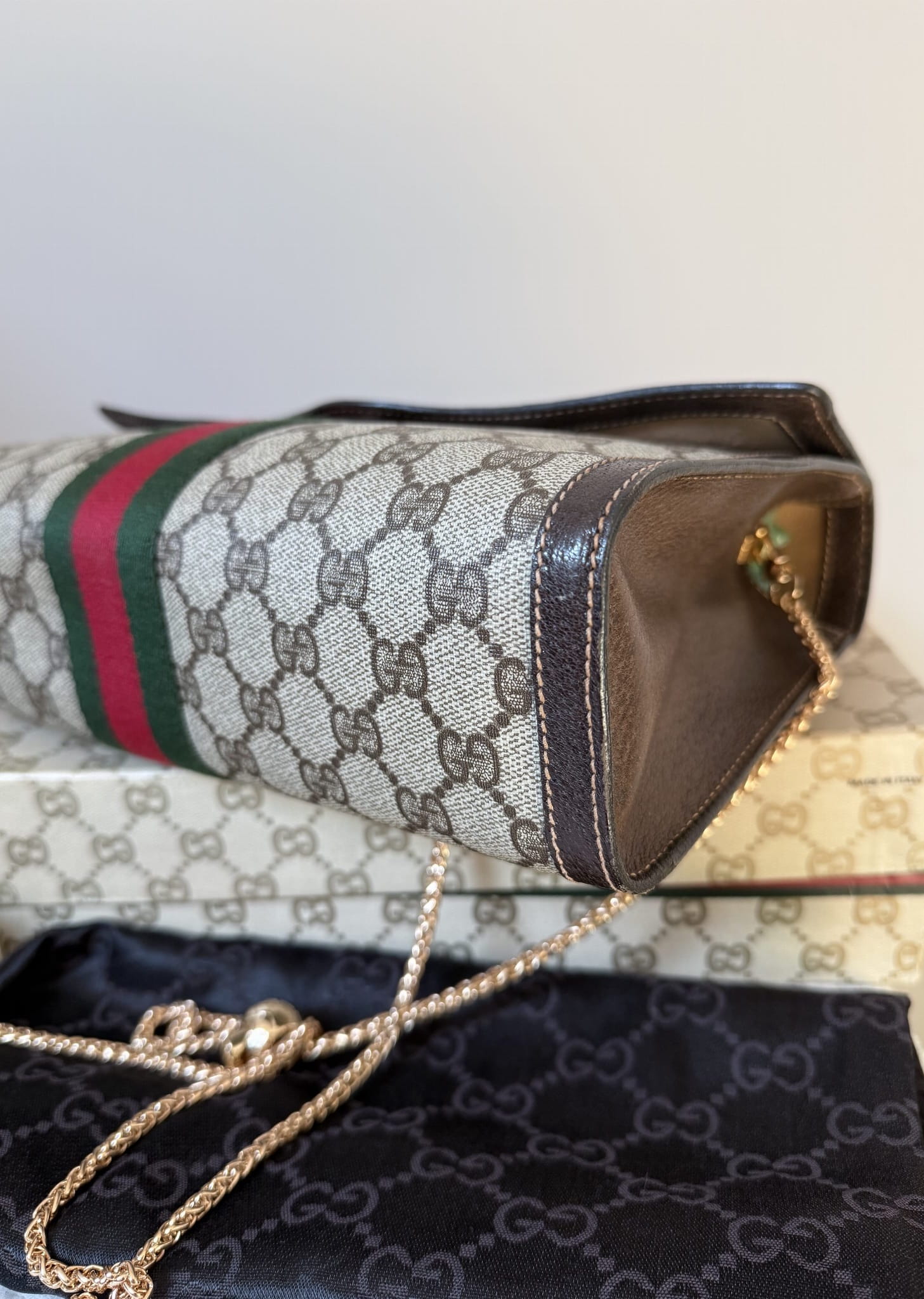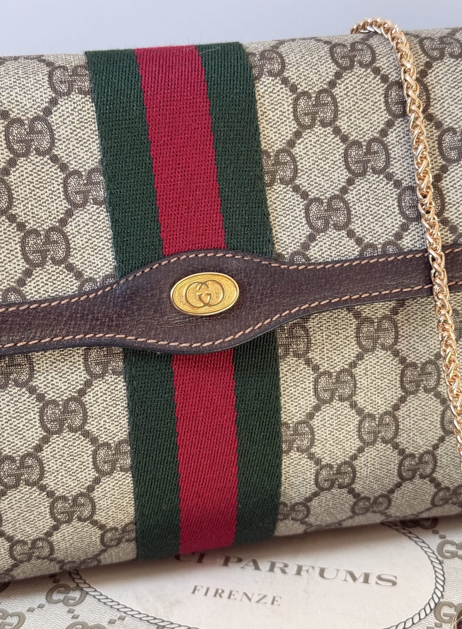 Elegancka torebka vintage od Gucci, wykonana z charakterystycznego płótna z monogramem GG w odcieniach beżu i brązu. Klasyczny design podkreśla kultowy pasek Web w kolorach zielonym i czerwonym, biegnący przez środek klapy. Wykończenia z brązowej skóry oraz złote zapięcie z subtelnym logo dodają całości luksusowego charakteru. Torebka zachowana w bardzo dobrym stanie, nie posiada żadnych uszkodzeń na monogramie, otarć czy plam. Środek pokryty jest jeszcze skórzaną warstwą, gdzieniegdzie delikatnie otartą na klapce, z czasem konieczne będzie wyczyszczenie środka . Brak zapachu. Łańcuszek nie jest oryginalnym produktem marki, jest to łańcuszek inny/akcesoryjny.