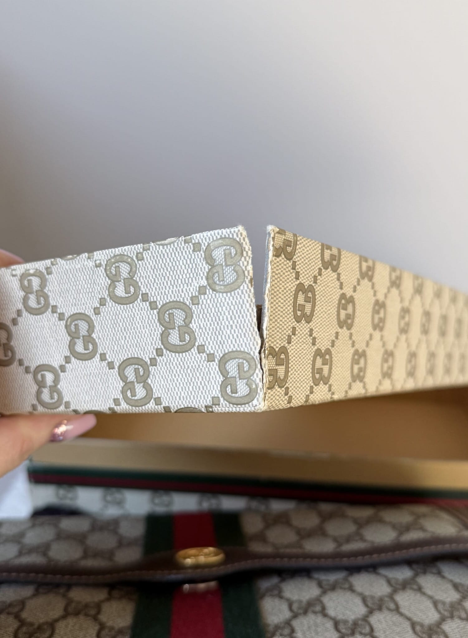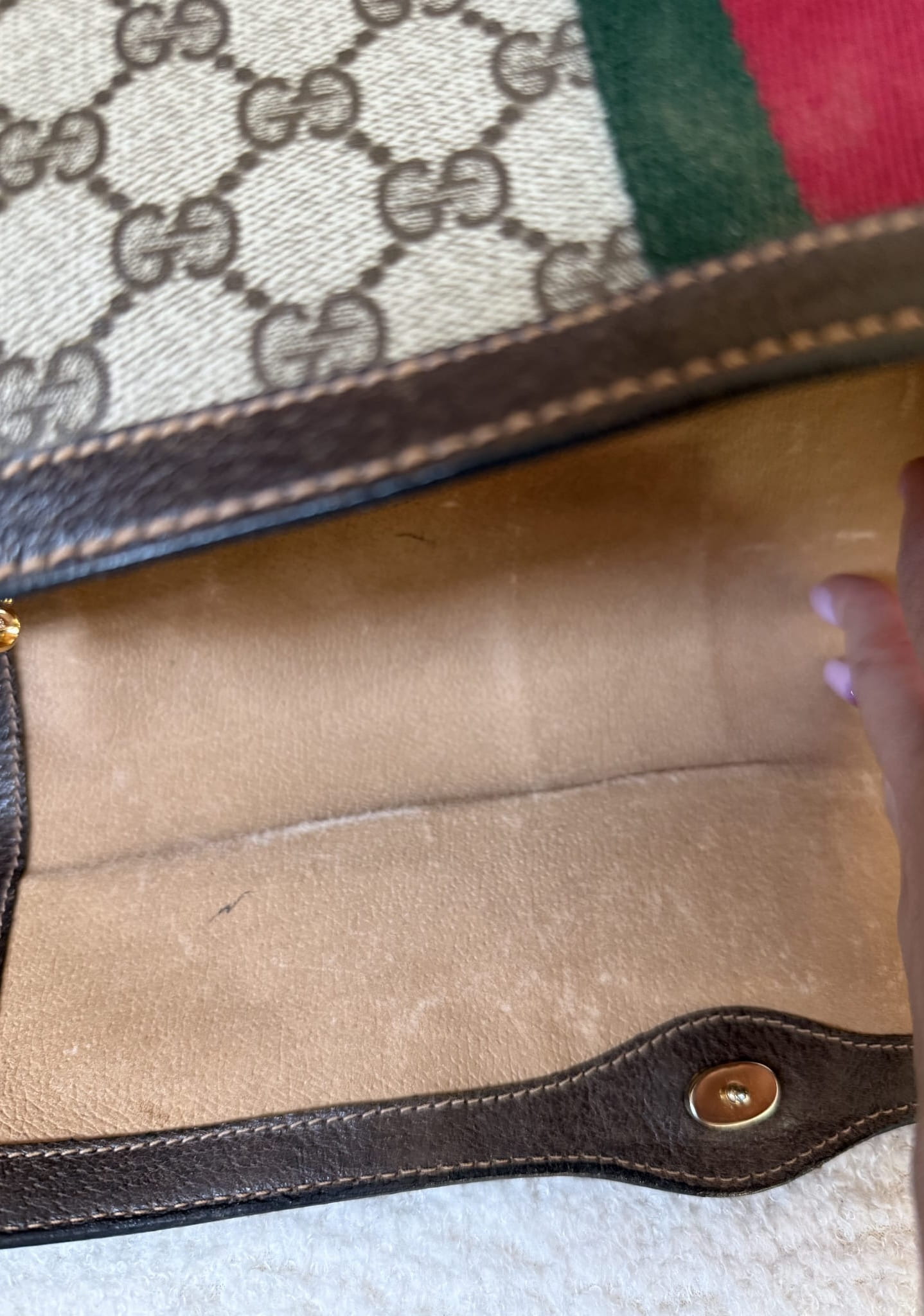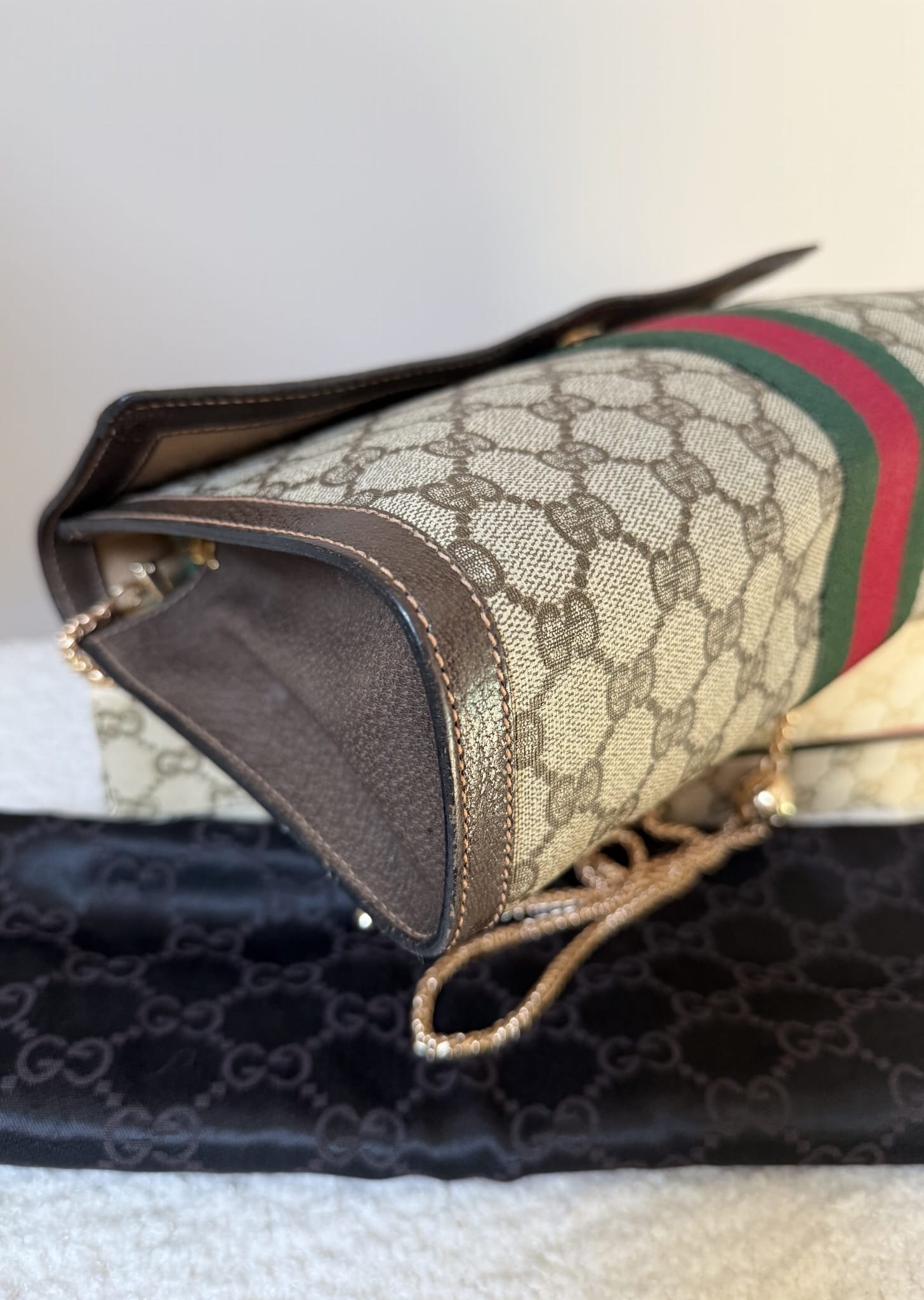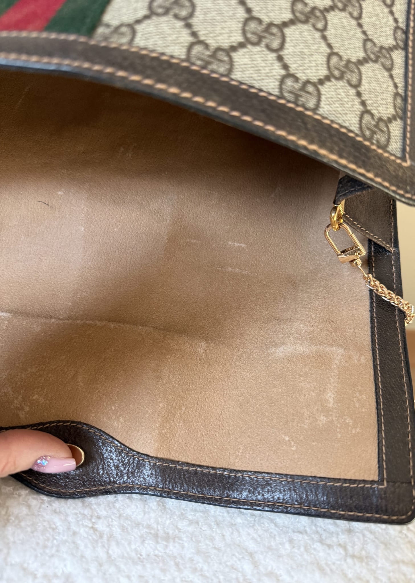 Elegancka torebka vintage od Gucci, wykonana z charakterystycznego płótna z monogramem GG w odcieniach beżu i brązu. Klasyczny design podkreśla kultowy pasek Web w kolorach zielonym i czerwonym, biegnący przez środek klapy. Wykończenia z brązowej skóry oraz złote zapięcie z subtelnym logo dodają całości luksusowego charakteru. Torebka zachowana w bardzo dobrym stanie, nie posiada żadnych uszkodzeń na monogramie, otarć czy plam. Środek pokryty jest jeszcze skórzaną warstwą, gdzieniegdzie delikatnie otartą na klapce, z czasem konieczne będzie wyczyszczenie środka . Brak zapachu. Łańcuszek nie jest oryginalnym produktem marki, jest to łańcuszek inny/akcesoryjny.