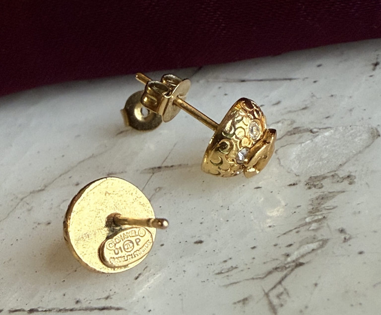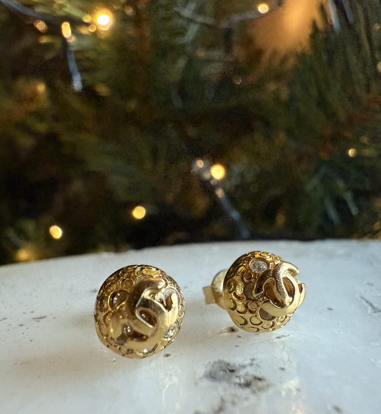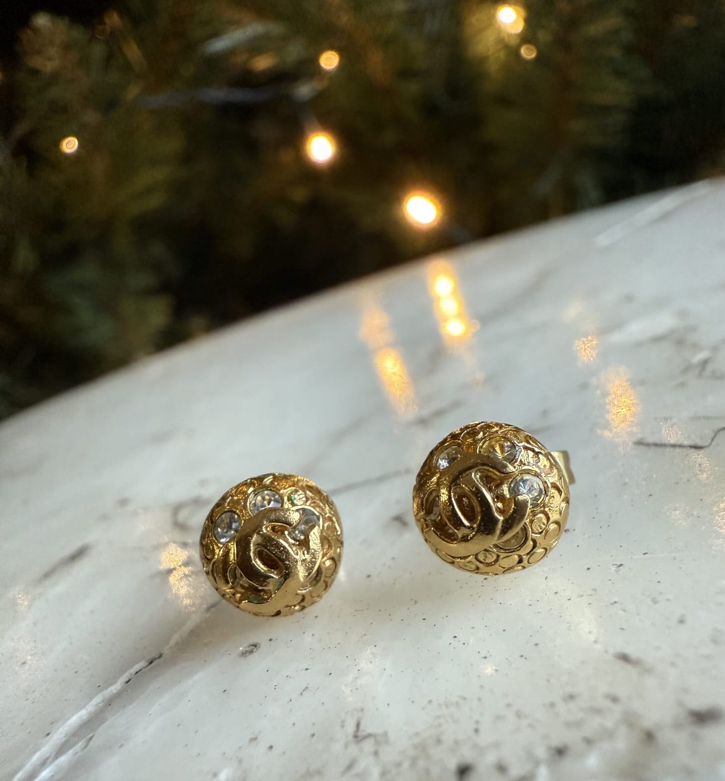 Wyjątkowe, pozłacane kolczyki vintage domu mody CHANEL, wykonane w klasycznym, ponadczasowym stylu. Okrągła forma z charakterystycznym motywem podwójnego logo CC, uzupełnionym subtelnymi, błyszczącymi kryształkami. Bogata faktura i precyzyjne detale nadają biżuterii luksusowy charakter.