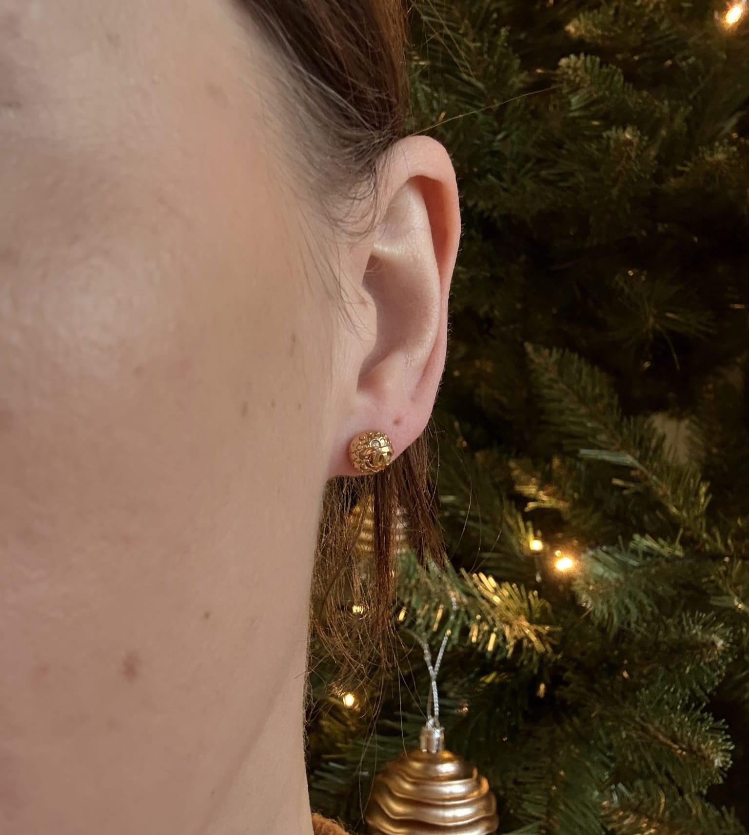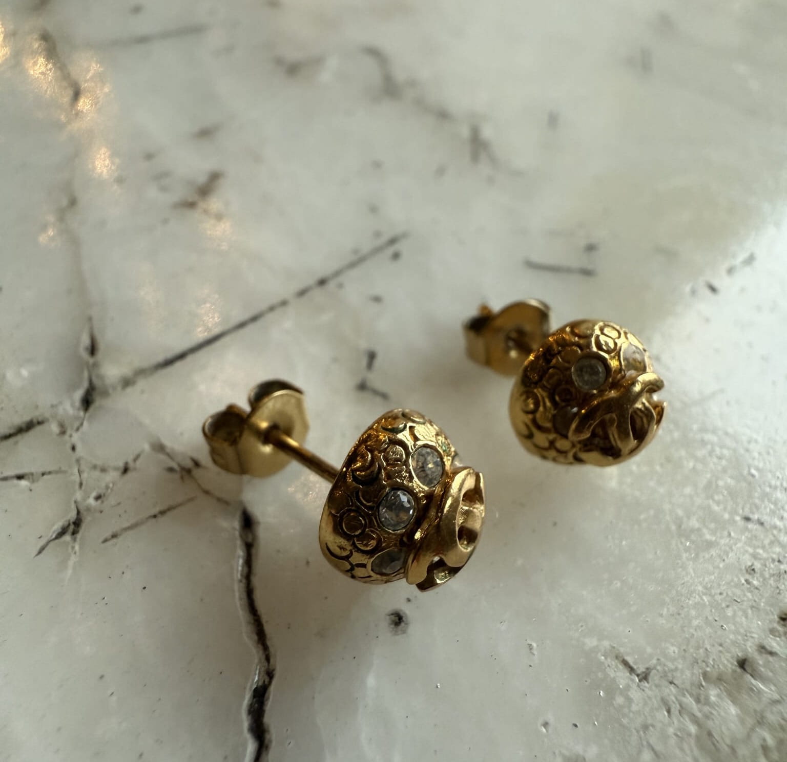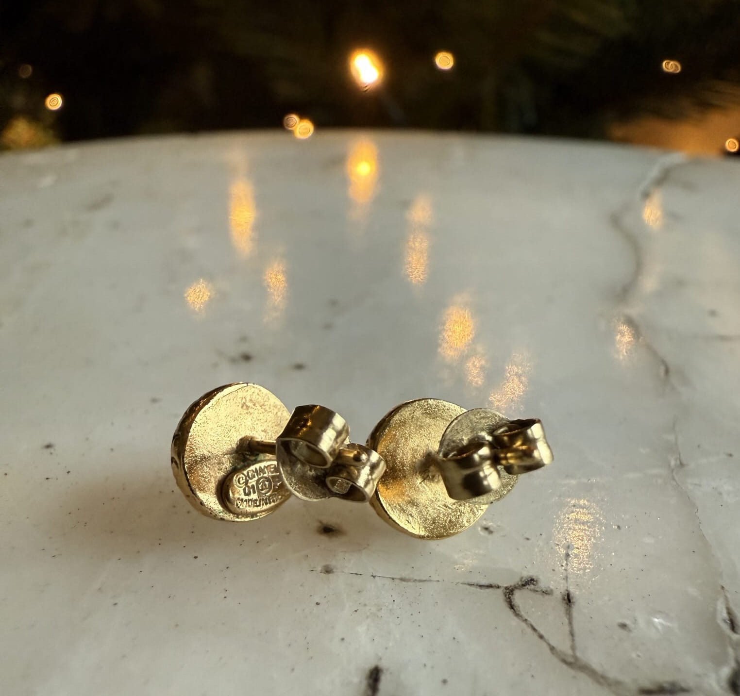 Wyjątkowe, pozłacane kolczyki vintage domu mody CHANEL, wykonane w klasycznym, ponadczasowym stylu. Okrągła forma z charakterystycznym motywem podwójnego logo CC, uzupełnionym subtelnymi, błyszczącymi kryształkami. Bogata faktura i precyzyjne detale nadają biżuterii luksusowy charakter.